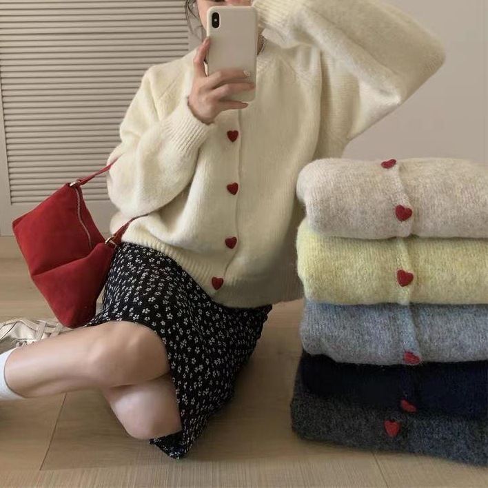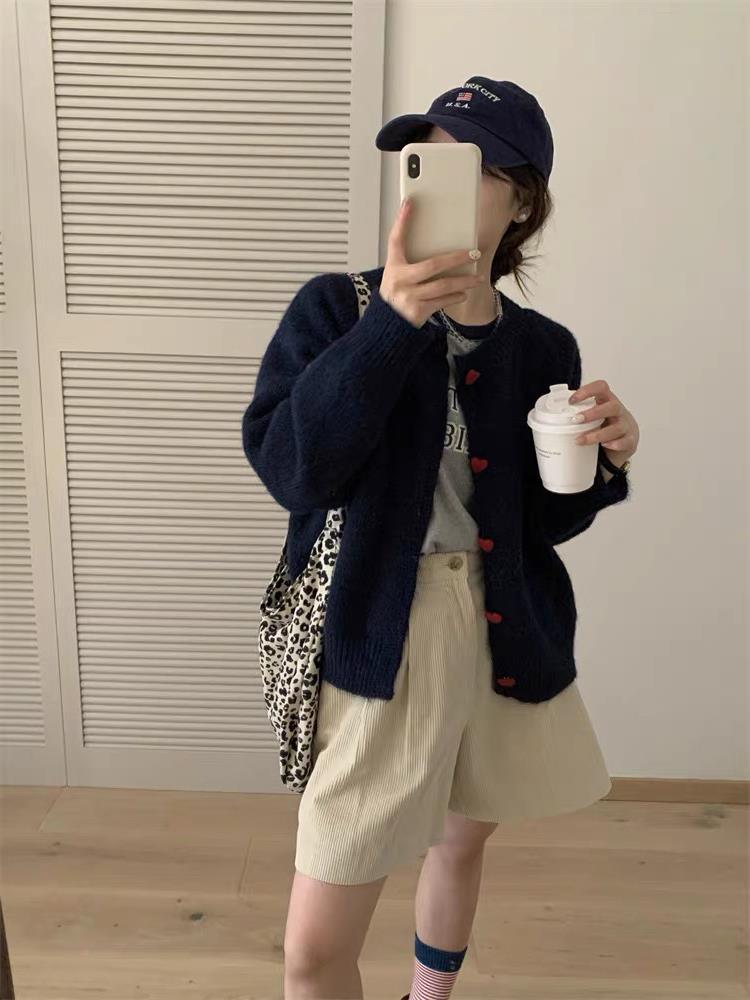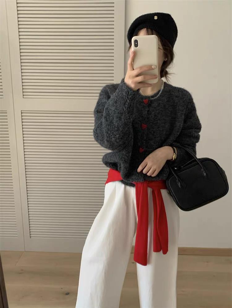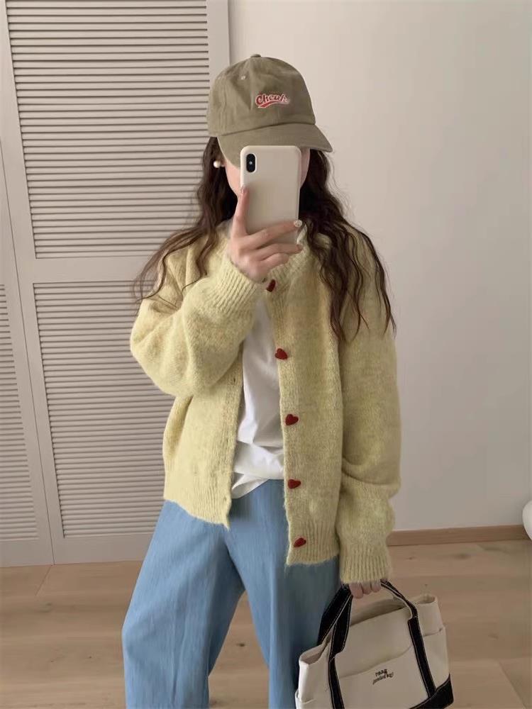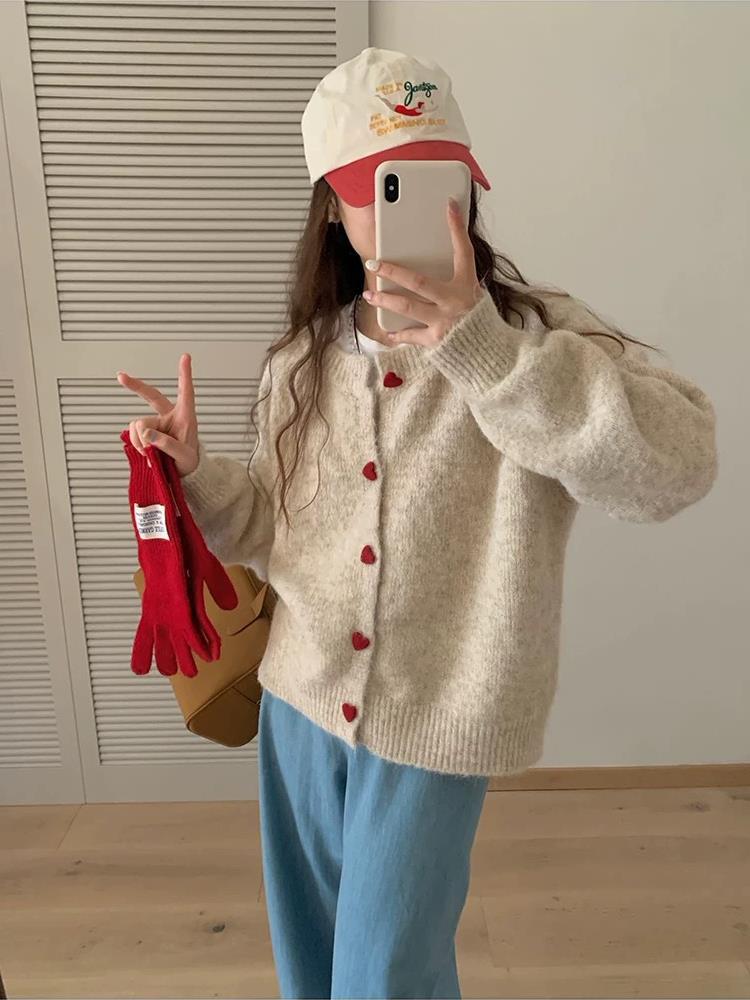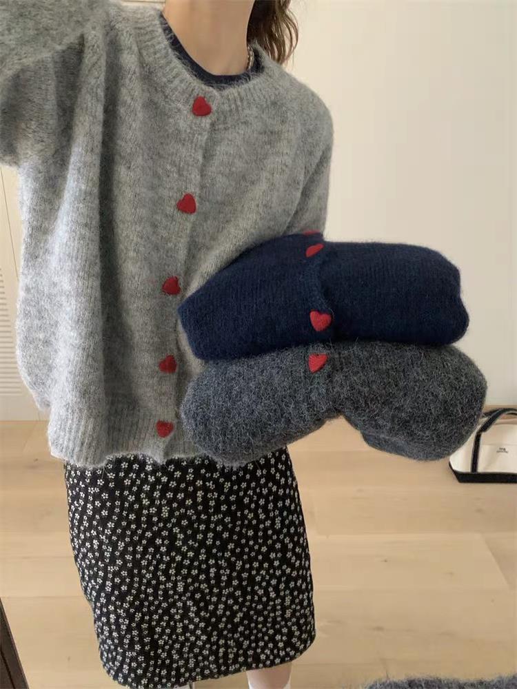 韓国風ラウンドネック万能デザインハートボタンニットカーディガン2025秋冬新作セーターアウター女性トップス
