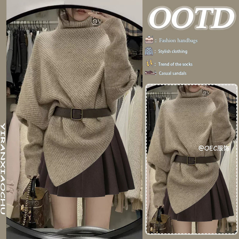 2025年秋冬新作セットアップ女性用アシンメトリーハイネックセーター&ハイウエストプリーツスカート2点セットリラックススタイル