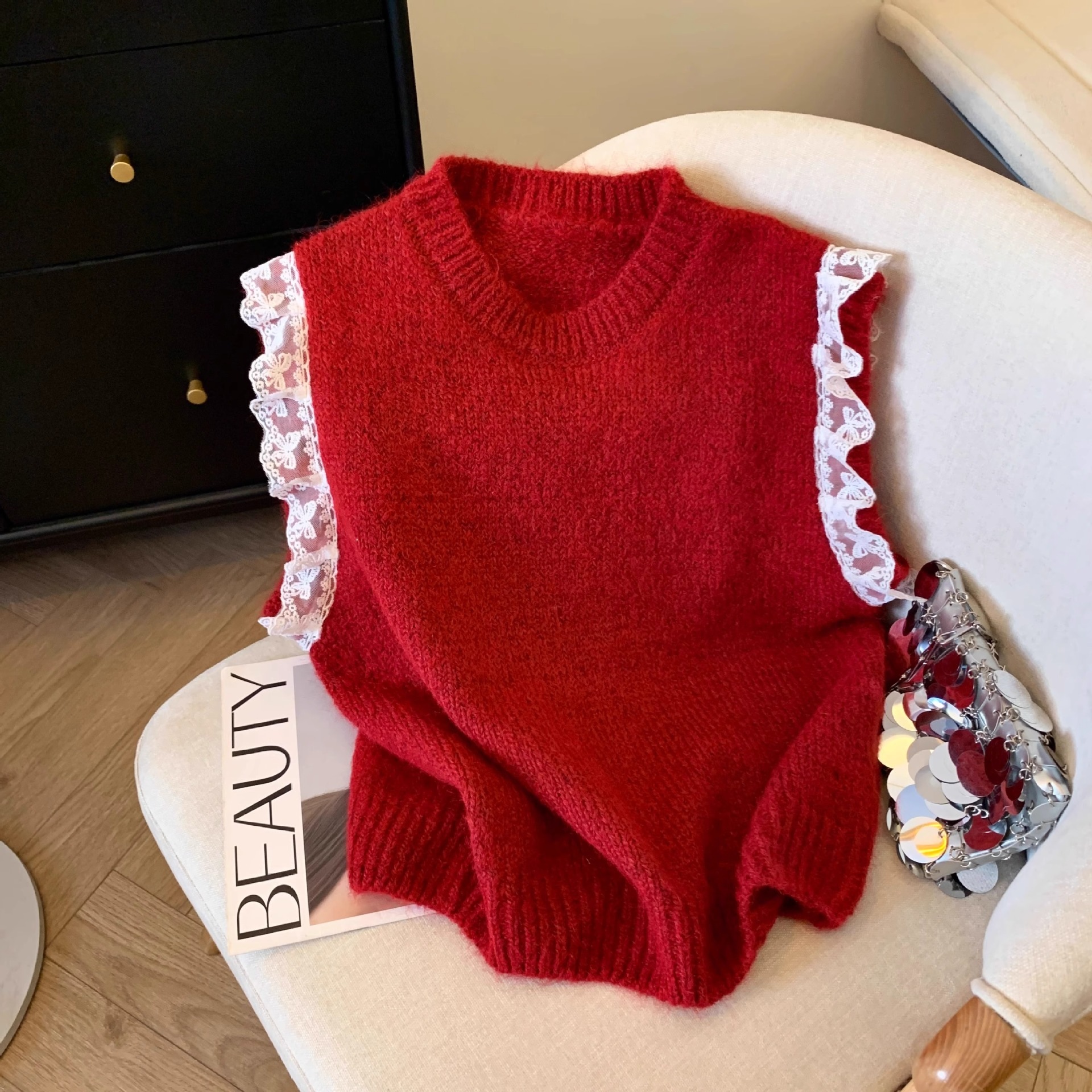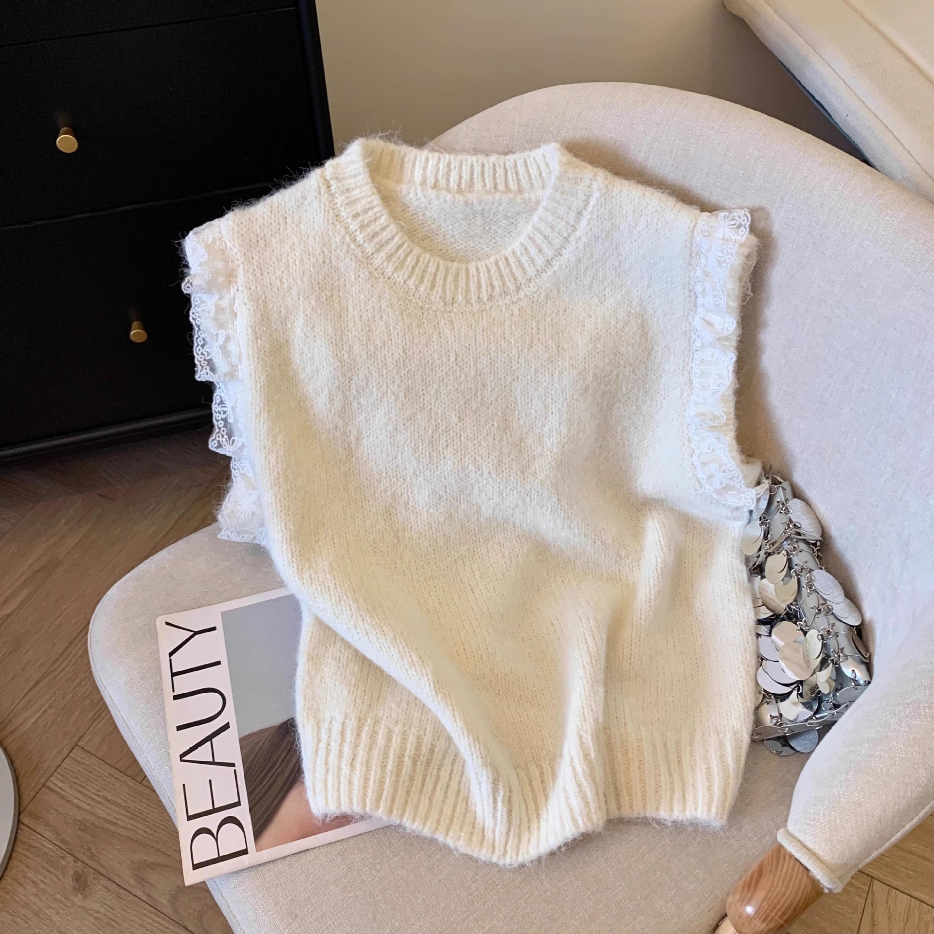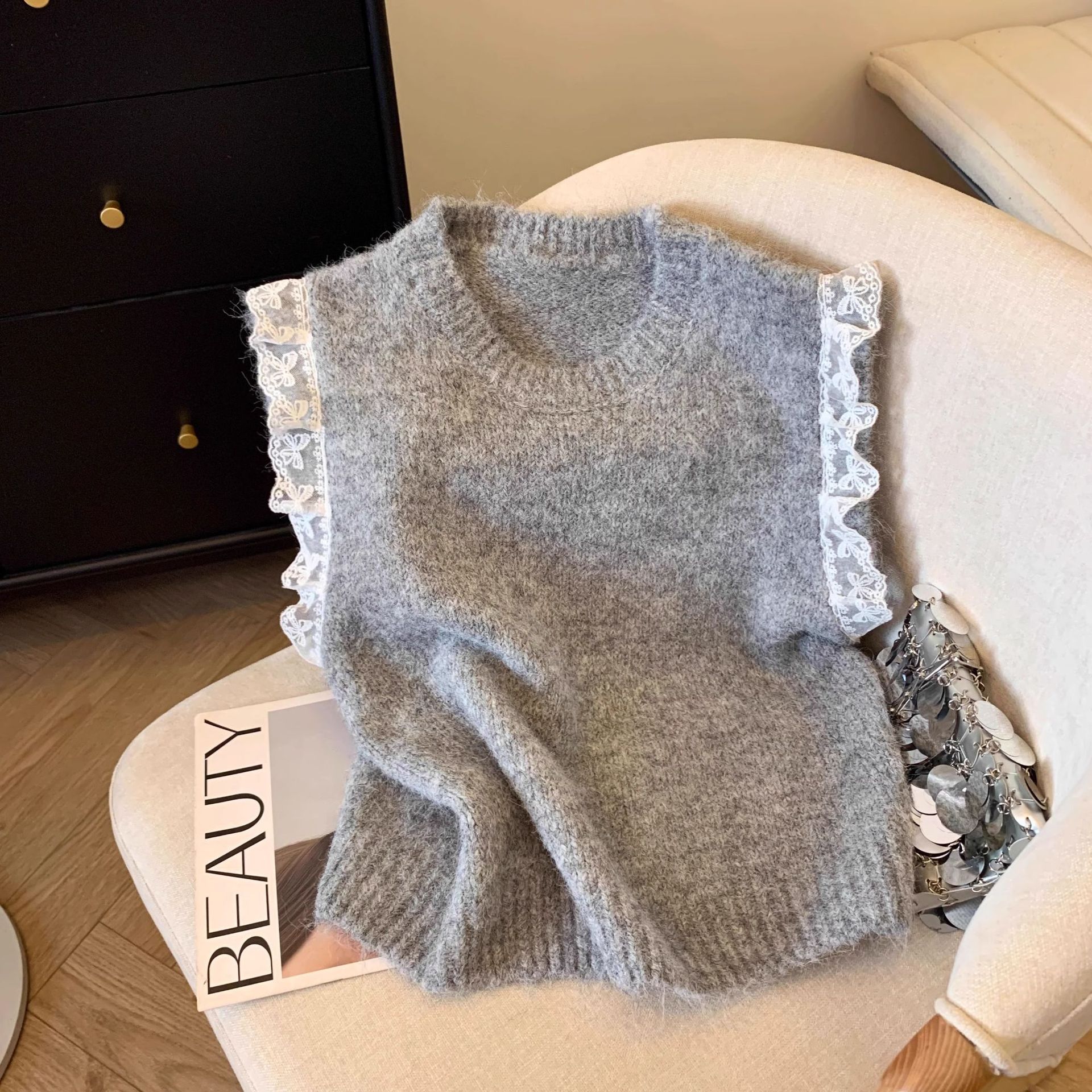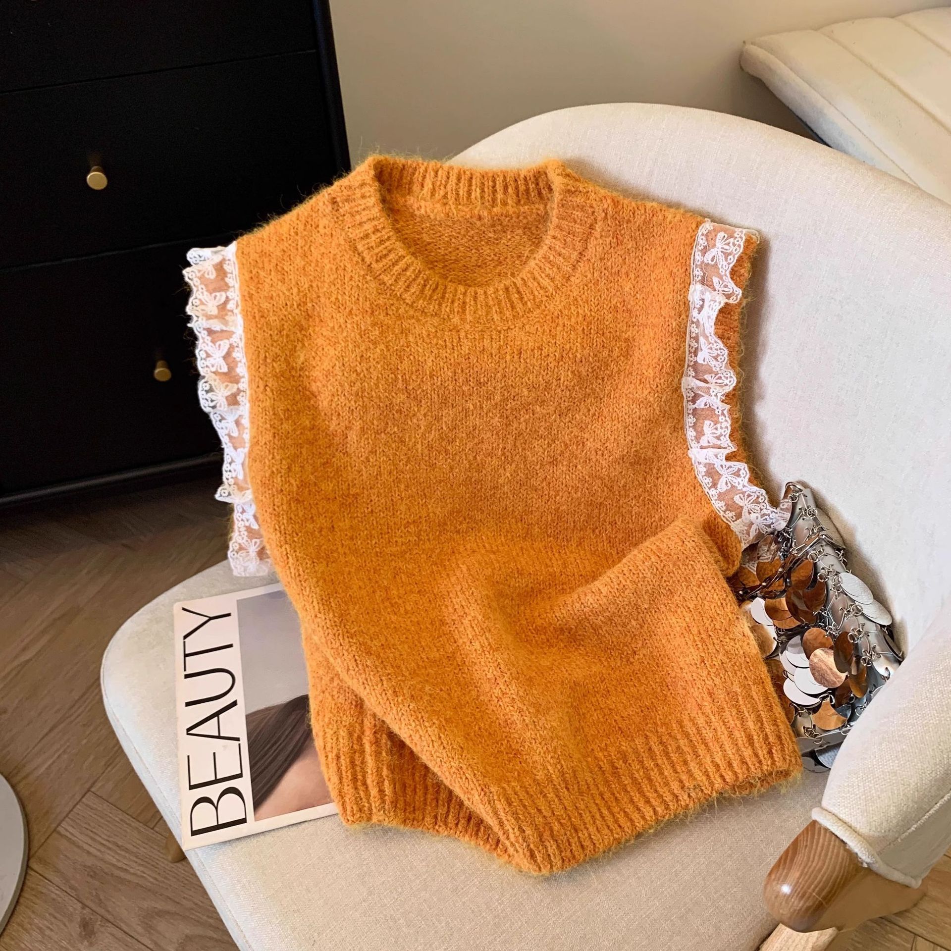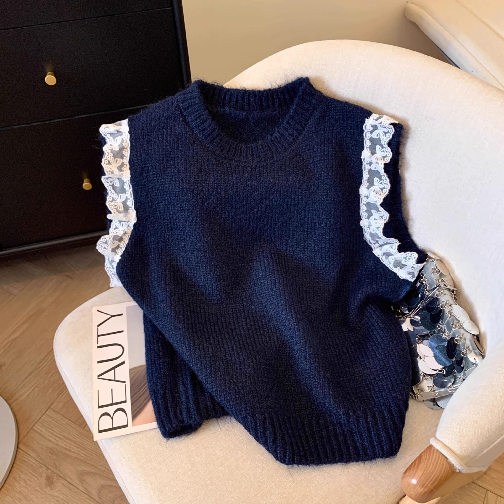【3日出荷】レースパッチワークノースリーブ ニット 秋クルーネックゆったりセーター ベスト レディース キャミソール