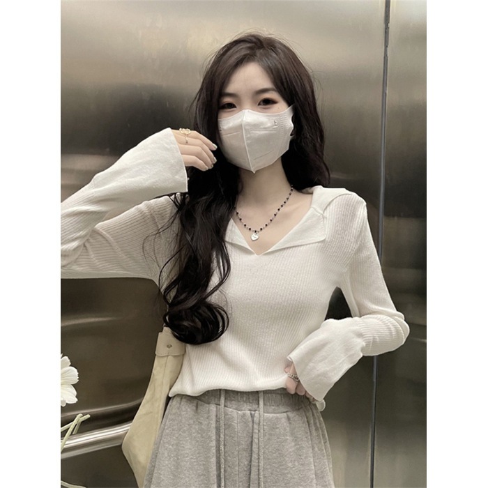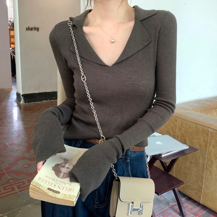 高級リブ編みポロカラーニットセーターレディース春・秋用Vネックフレンチインナー長袖ベースレイヤートップス