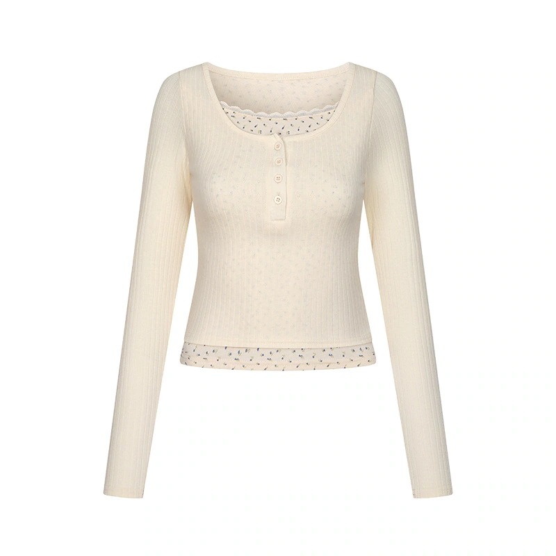 純粋でセクシーなレースのフェイクツーピースUネック長袖Tシャツ女性用春秋フレンチスタイルスリムフィットインナー甘辛系トップス