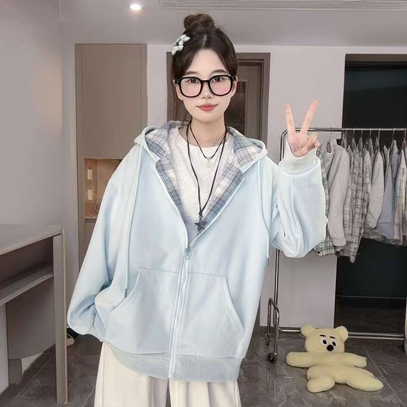 カーディガン風フード付きスウェットジャケット レディース秋冬2025新作 大きめサイズ チェック柄パッチワークデザイン ゆったりトップス