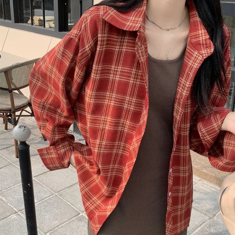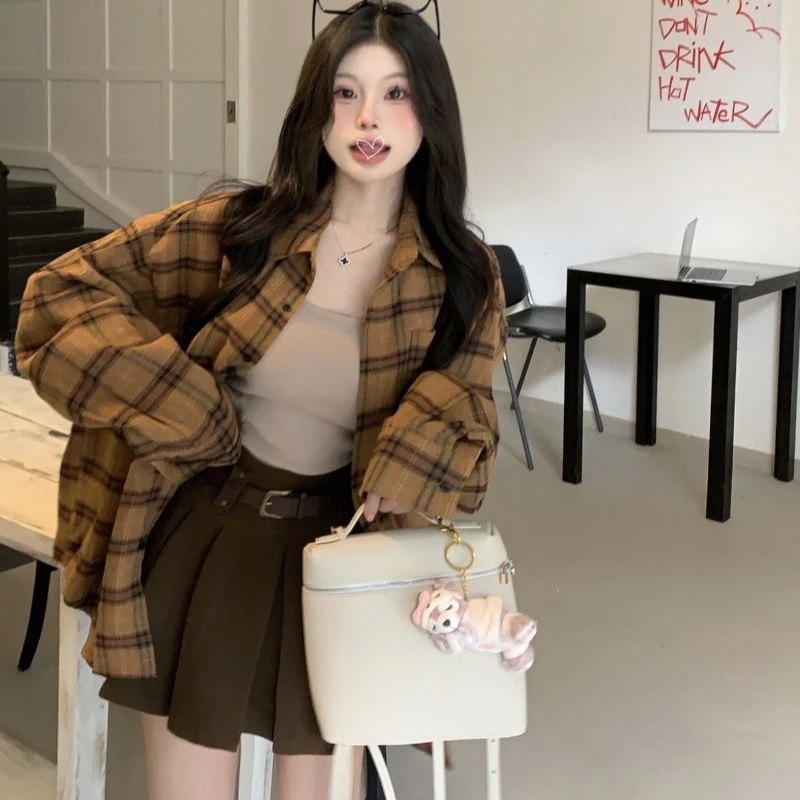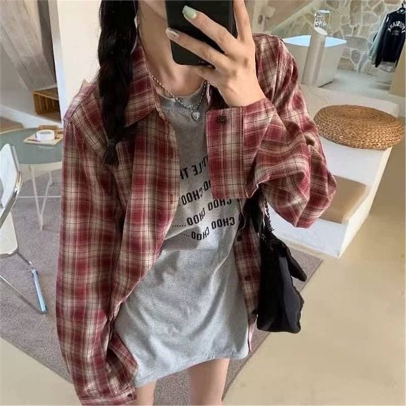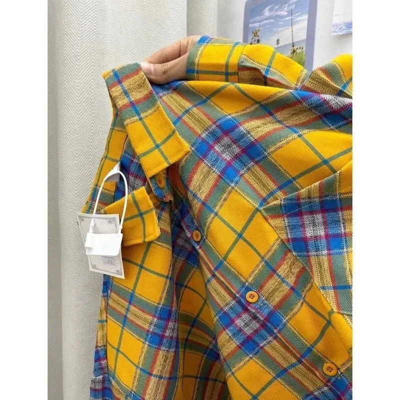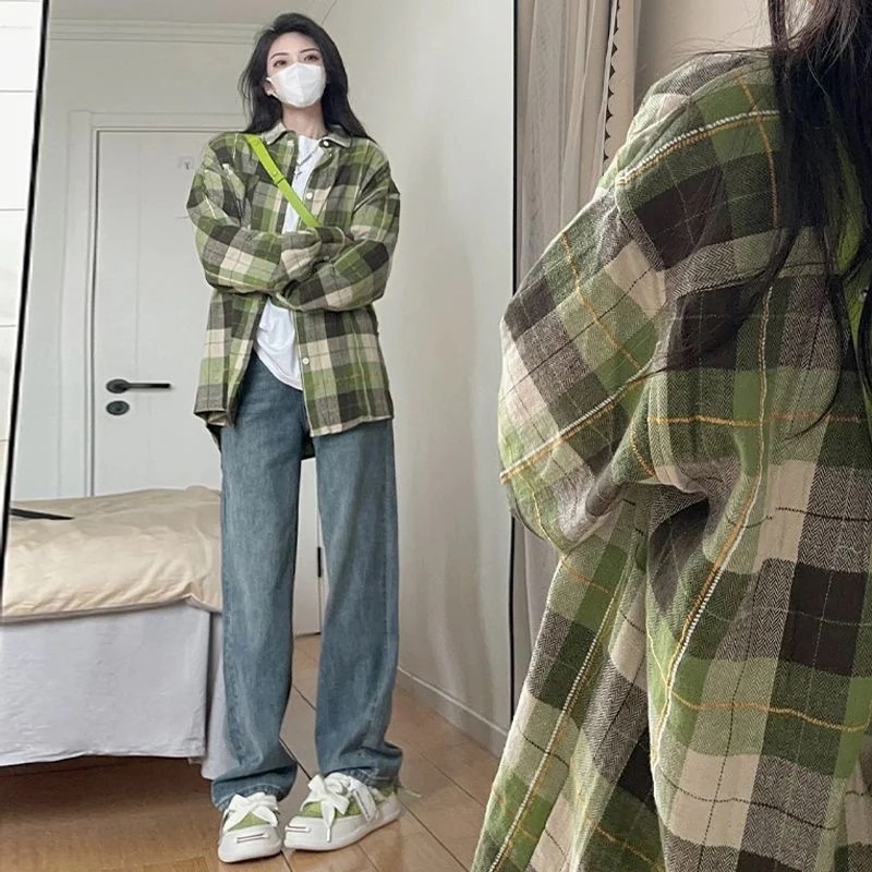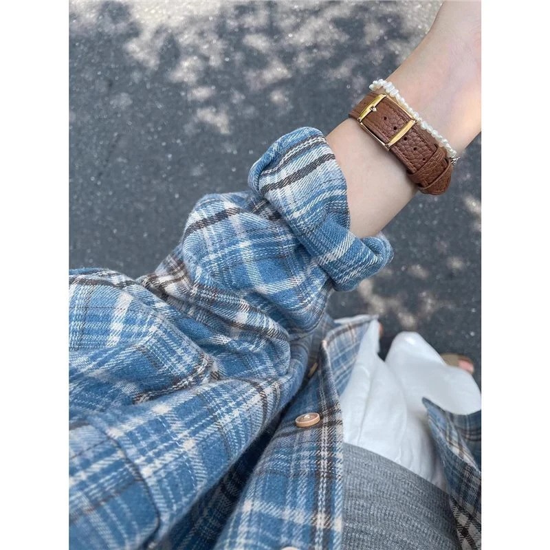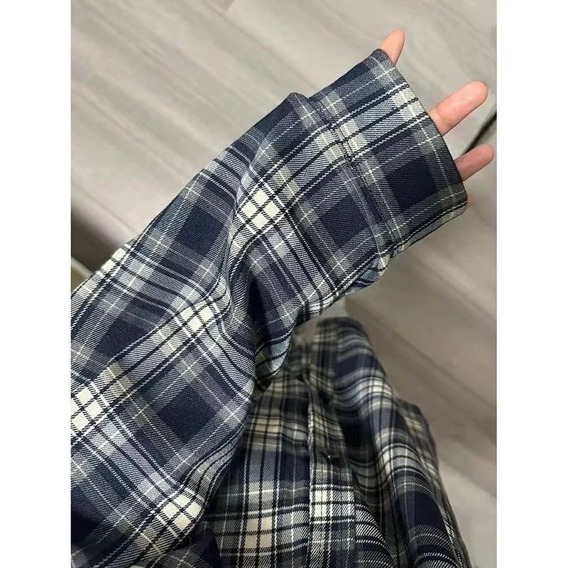国潮ブランド ブルーチェック長袖シャツ 女性用 春・秋用 ゆったりオーバーサイズ ハラジュク風 カジュアル 合わせやすいシャツ