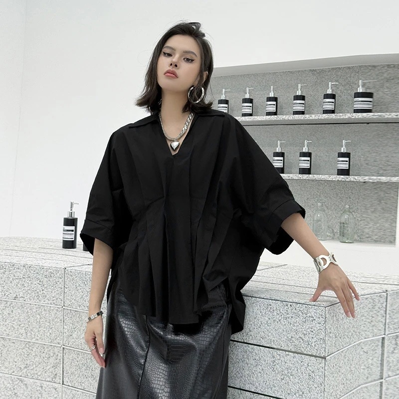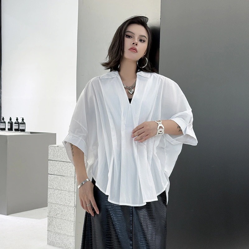 フランスの気品vネックトップス不規則なしわのシャツ韓国新しいモデルゆったり大きいサイズ 通勤上着