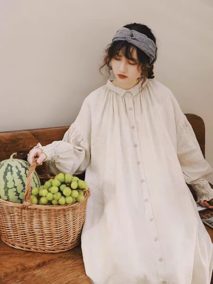 日系レディースドレス 森系キュートなラペルワンピースコットンリネン素材のプリーツ アーティスティックレトロ森女風 禅の精神を込めた