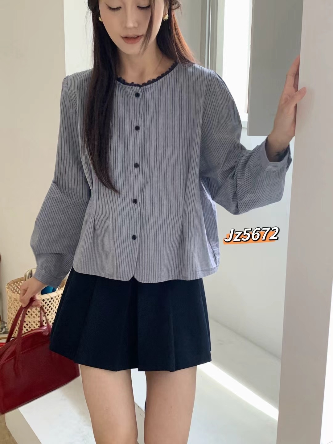 ストライプ長袖シャツ日系森女系レース丸首シングルボタン上品でスリム効果のあるおしゃれな女性用ブラウス