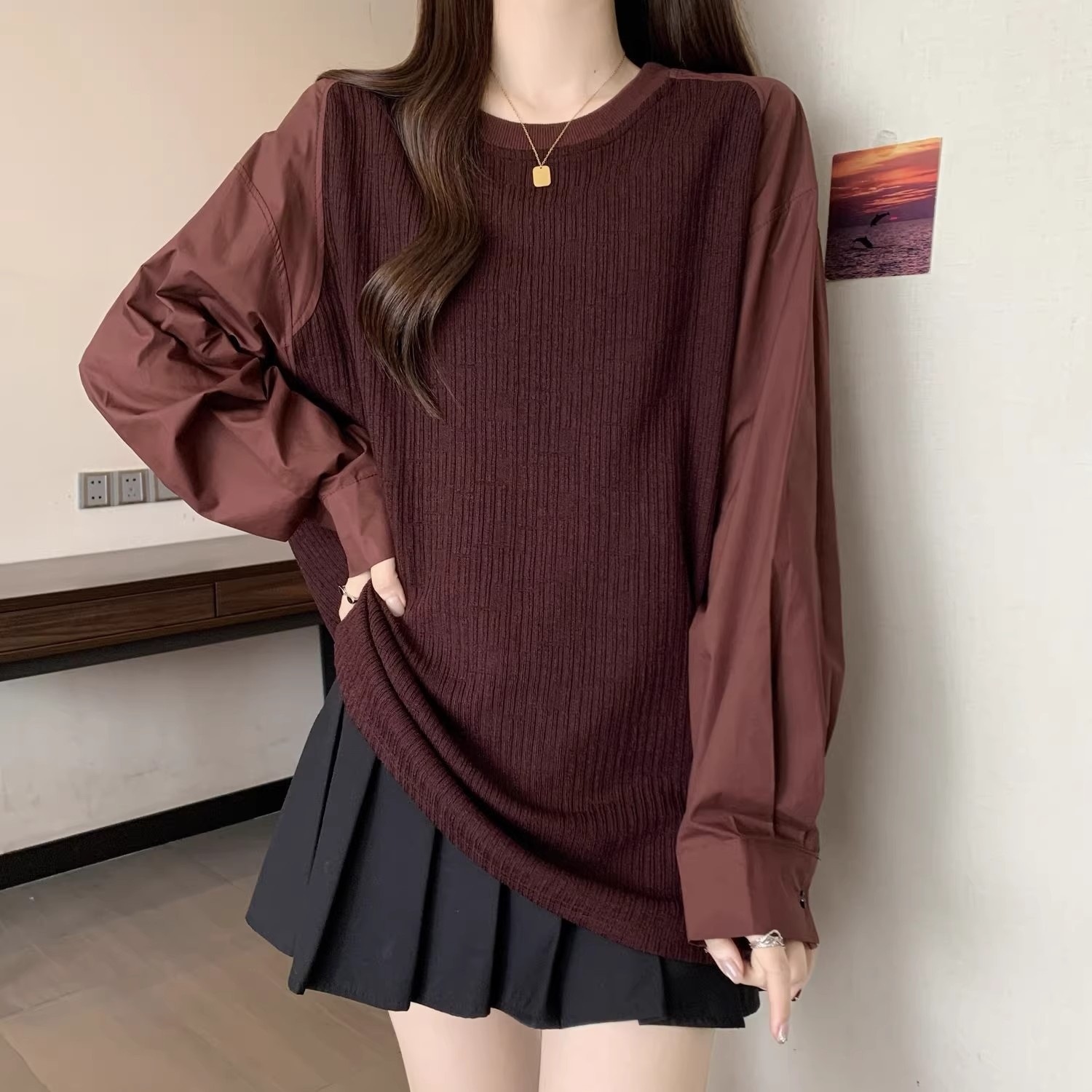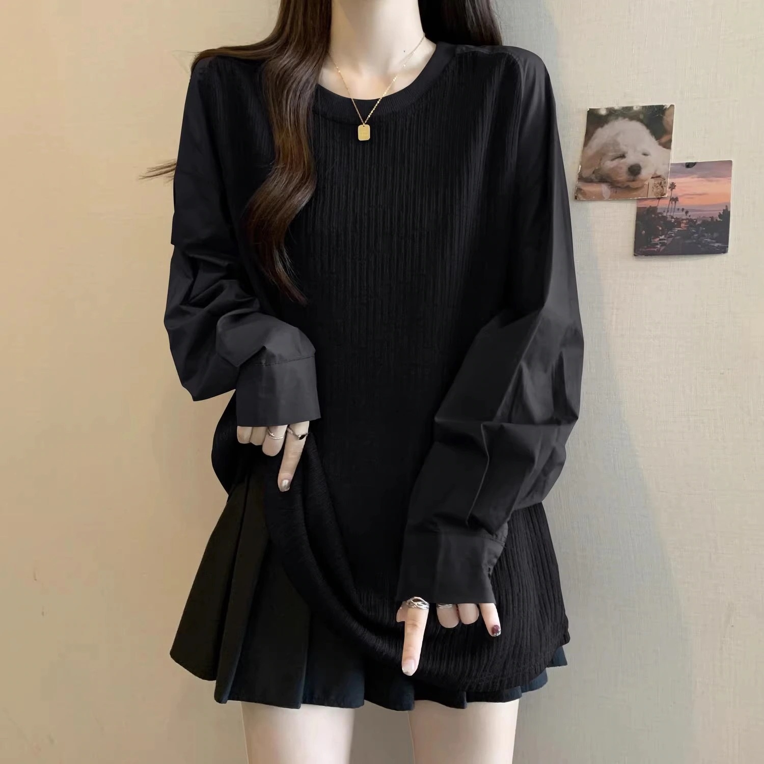 オーバーサイズ ツートン スウェットシャツ 女性用 春・秋用 新作 ゆったり長袖トップス
