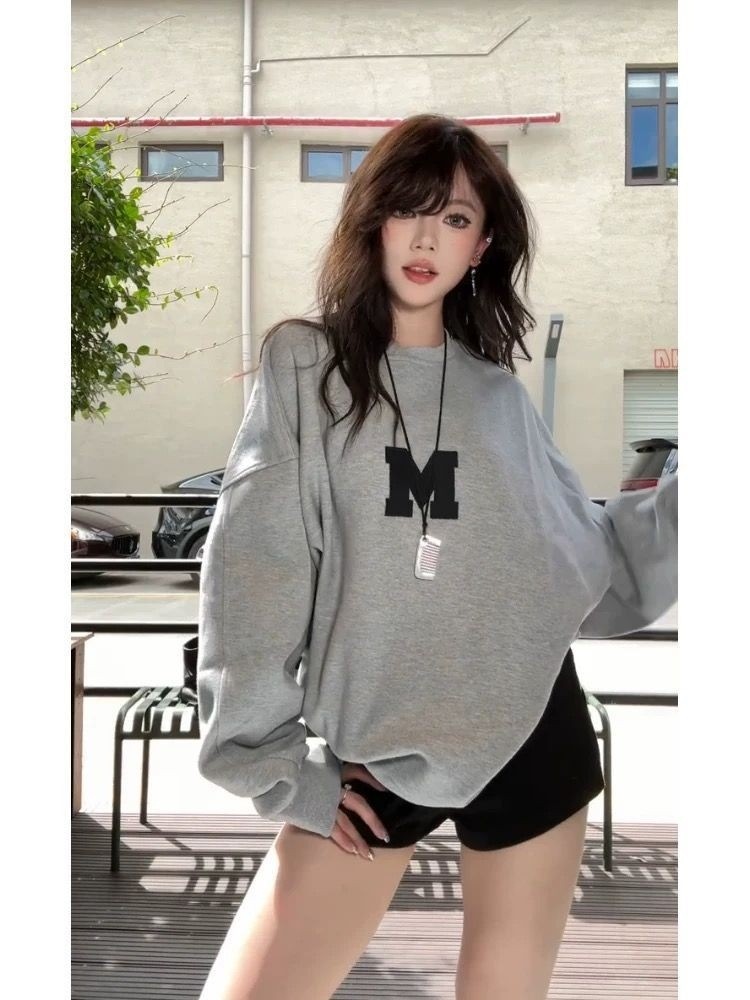 アメリカンスタイル ドロップショルダー スウェットシャツ 女性用 秋用カジュアル 丸首 ゆったりサイズ 長袖トップス