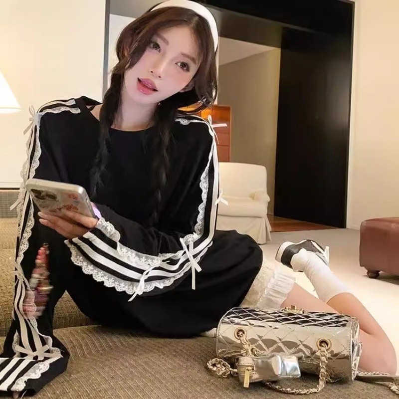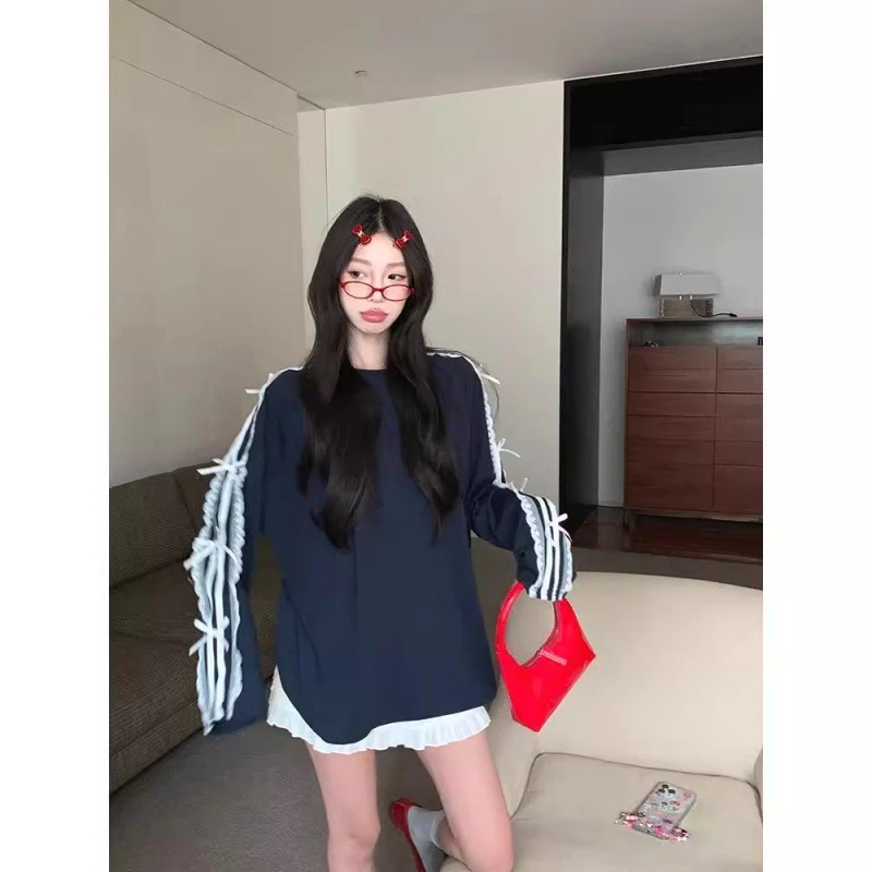 レースパッチワーク 丸首スウェットシャツ 長袖Tシャツ 女性用 春・秋用 韓国風 やや長めのトップス