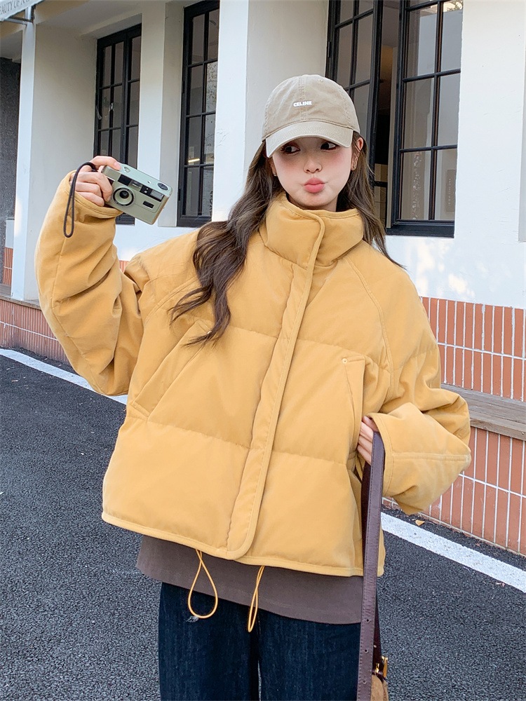 2025 年冬季 レディース ガーリックイエロー スタンドカラー ダウンジャケット ショートレングス 小柄向け トレンド 超可愛い ユニークで絶美
