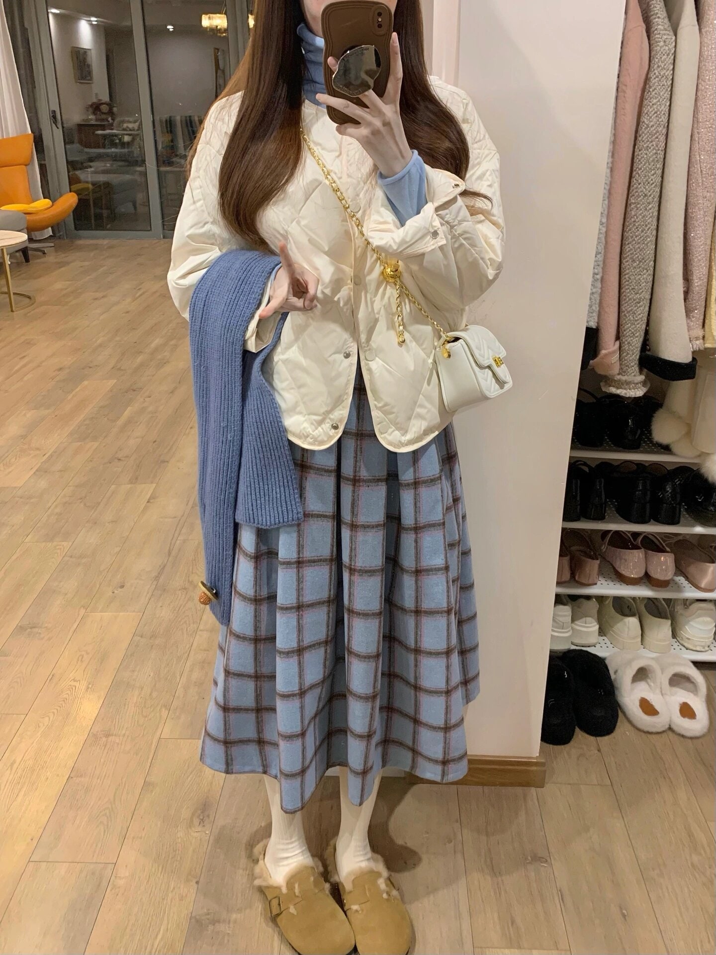 日系レトロブルーチェックスカート秋冬モデル 上品で高級感あるスクールスタイル ハイウエスト 低身長向けロングスカート