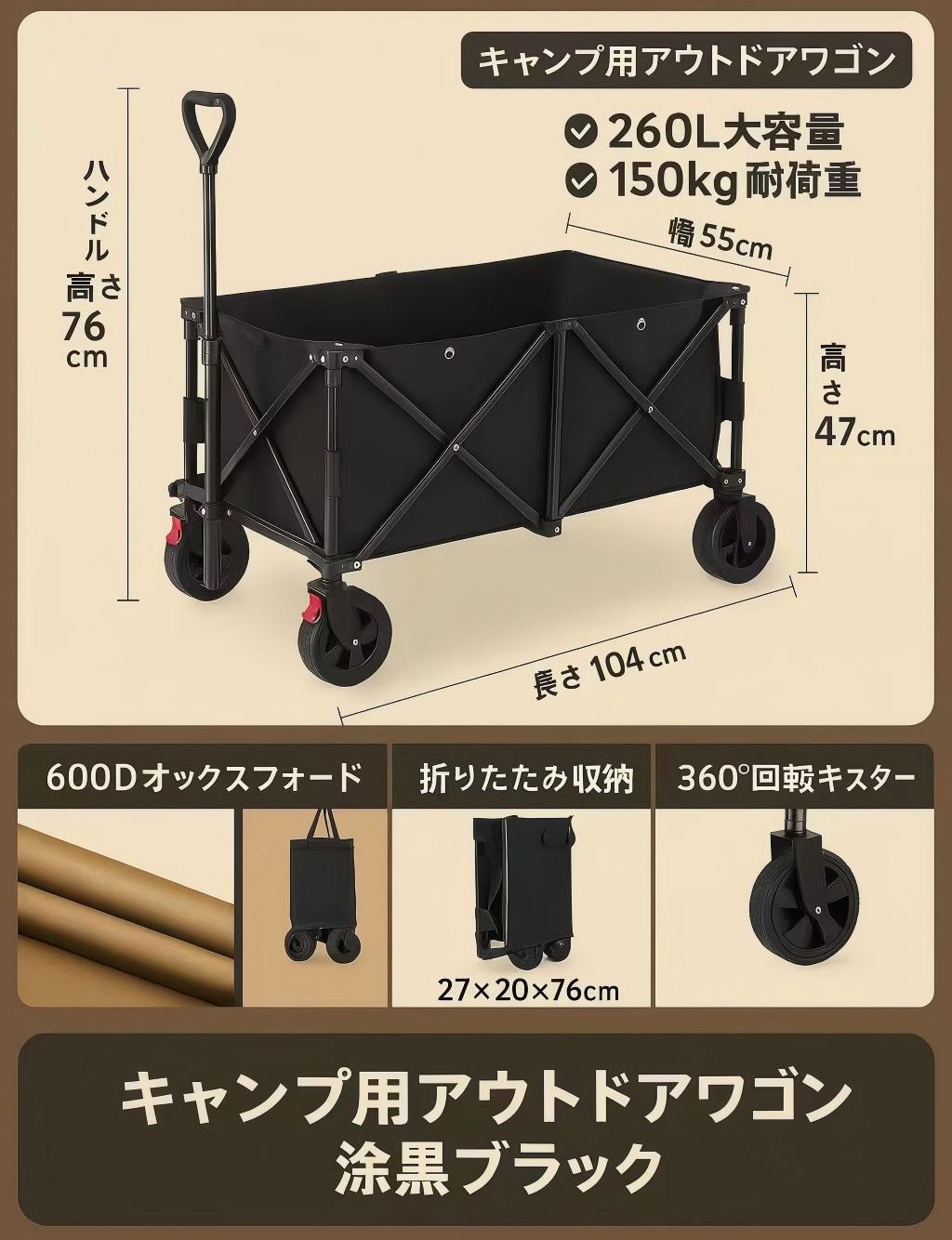 最新版 大容量260L&耐荷重150kg アウトドアワゴンギャザー型折りたたみキャンピングカー/ブラック