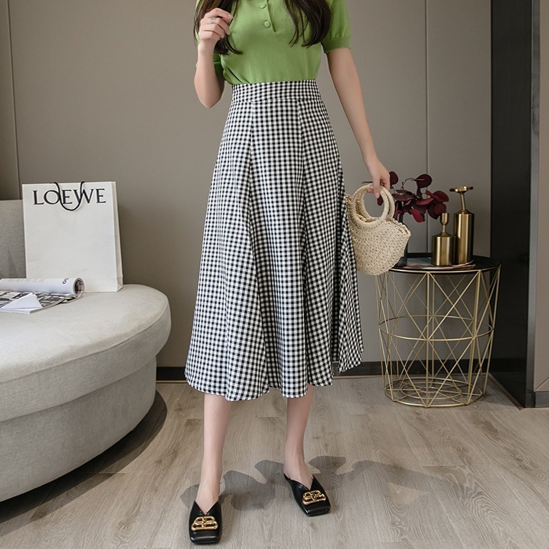 スカート ミディアム丈 ポリエステル ギンガムチェック レディース Aライン ハイウエスト プリーツ