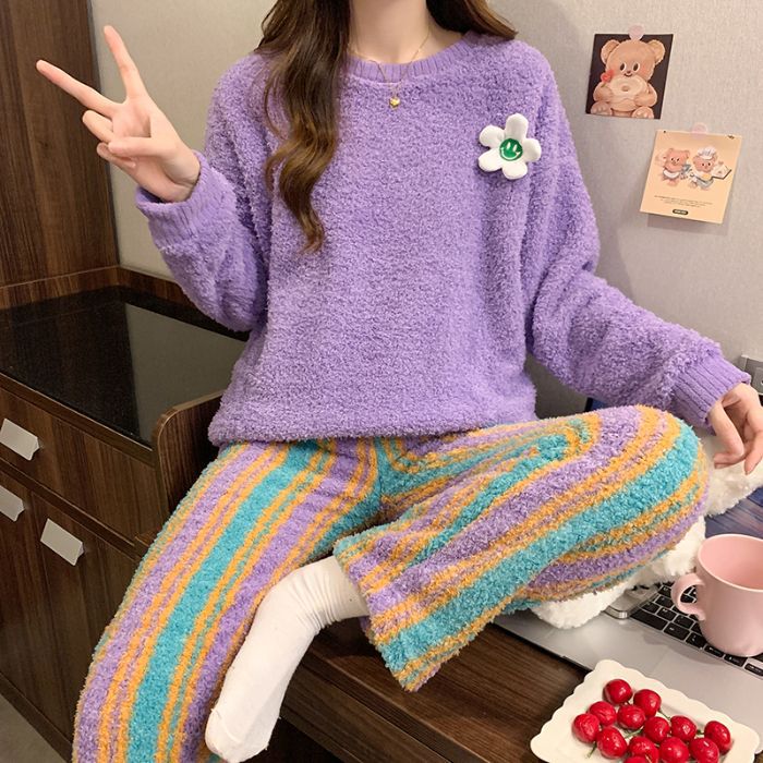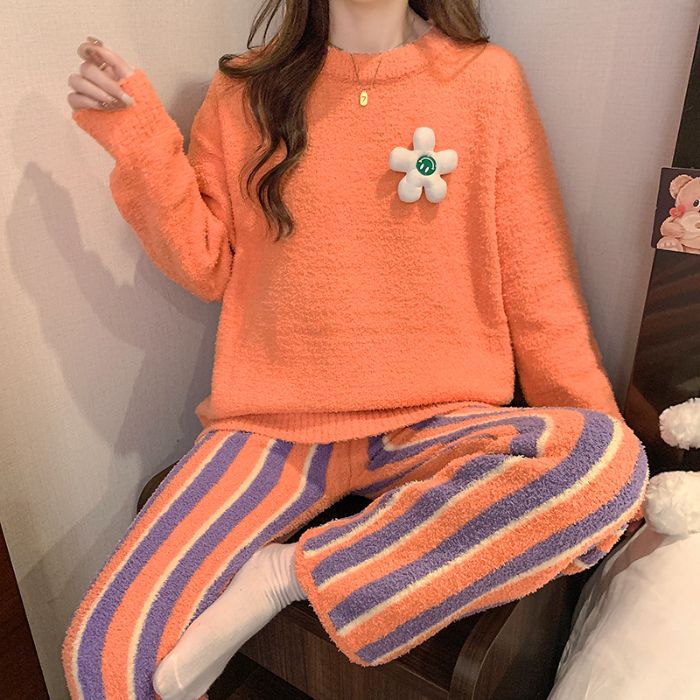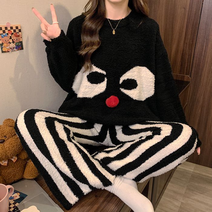 半袖フリースパジャマ女性用秋冬 新作裏フリース厚手韓国風キュートカジュアルゆったり保温ルームウェアセット