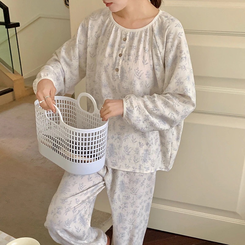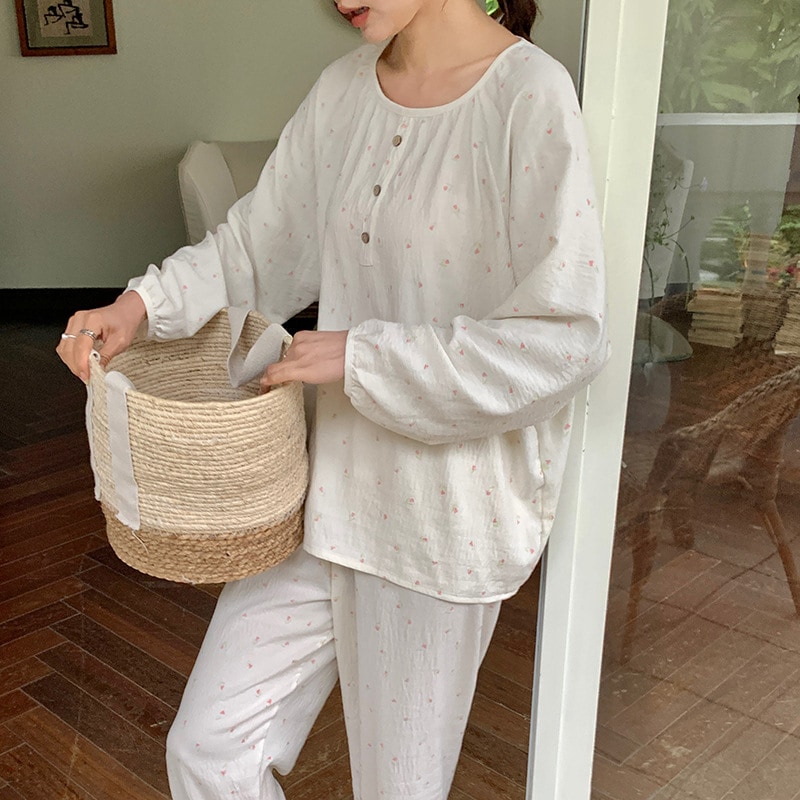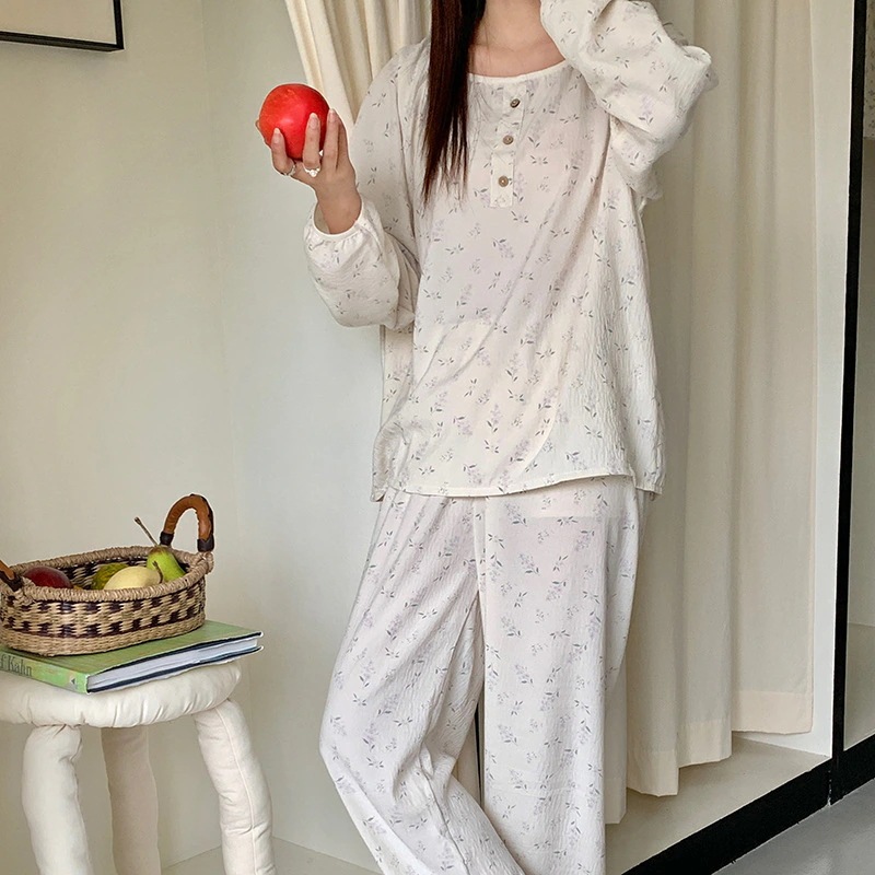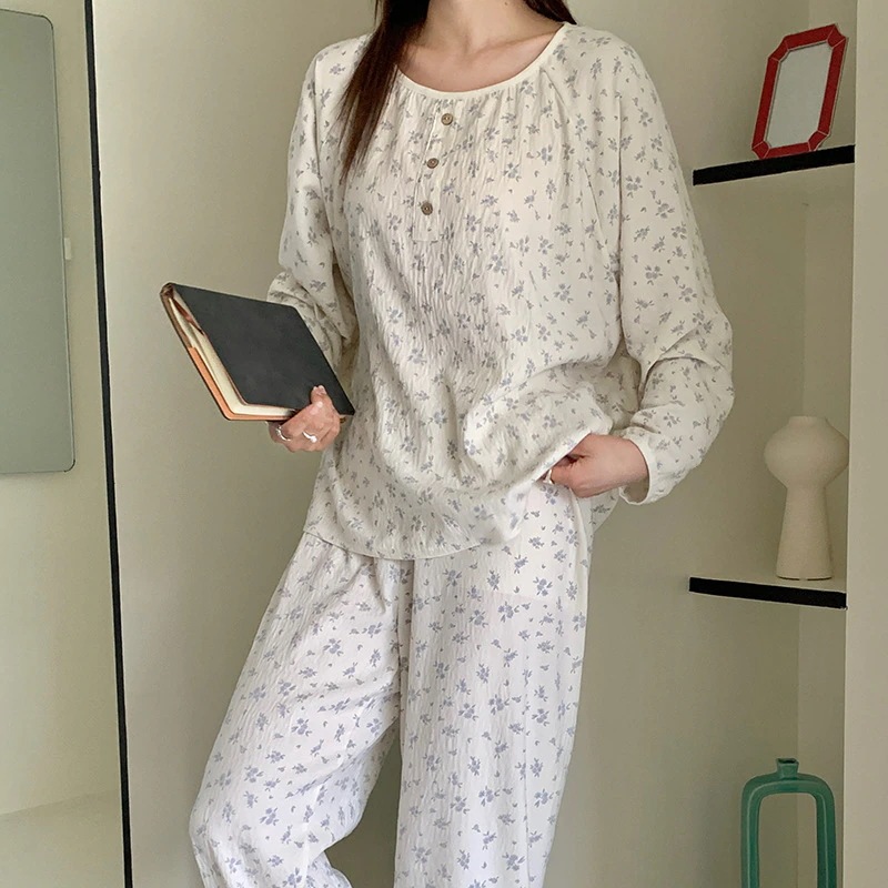森島春の新作ホームウェア女性用 プリントシンプル丸首長袖花柄トップス薄手アウター付きパジャマセットホームウェアセット