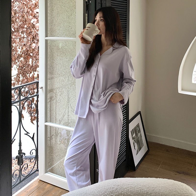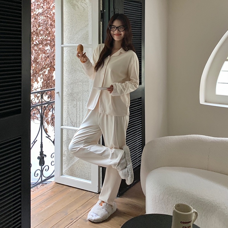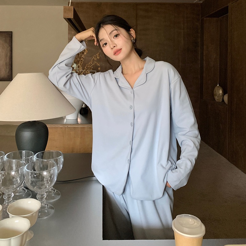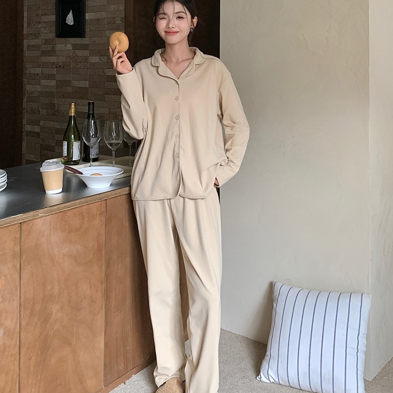 秋冬無地レディースルームウェアボタン付きラペル長袖トップスパンツセットゆったり着られるパジャマルームウェアセット
