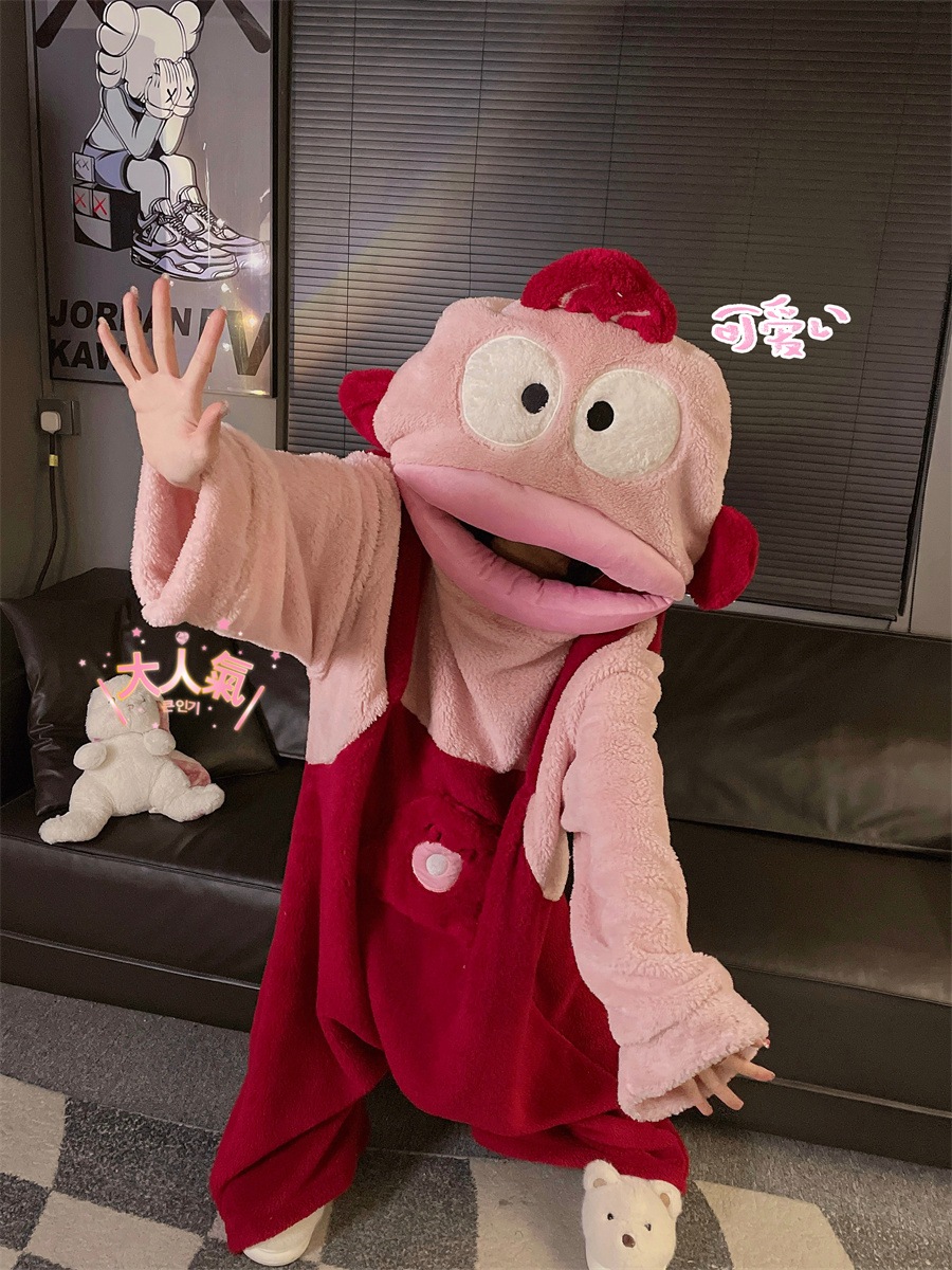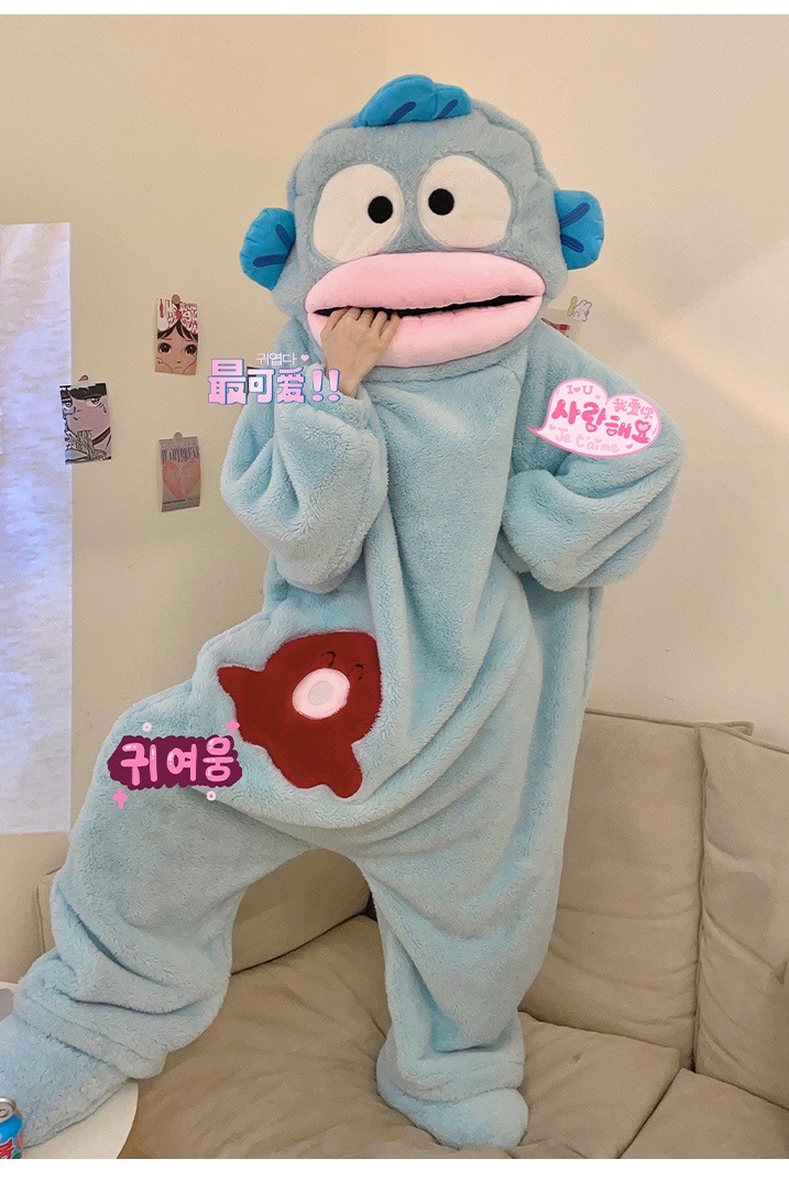 可愛いアニメ風おバカなウツボハントン柄カップルパジャマ男女兼用冬用厚手コーラルフリースルームウェア