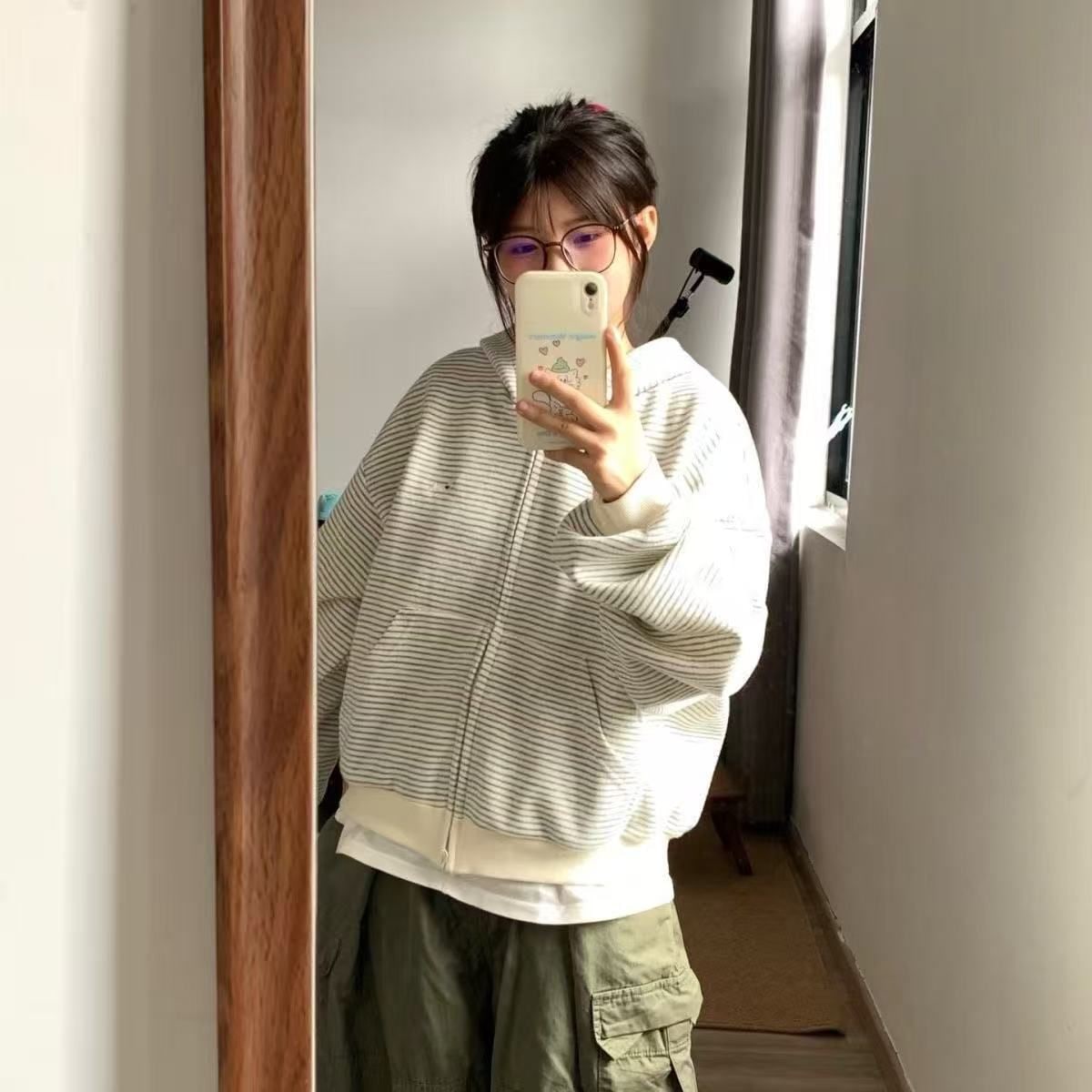韓国風 早秋コーデ ストライプカーディガン フード付きフーディ アウター レディース 2025年秋新作 ゆったり 長袖トップス