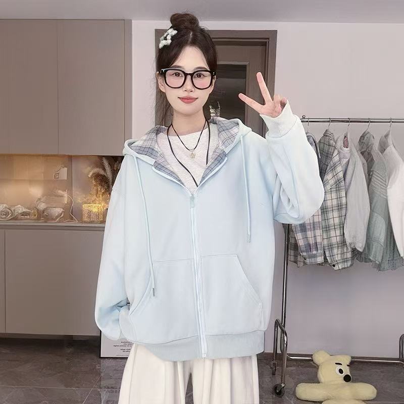 カーディガン フード付きスウェットジャケット アウター レディース 秋冬2025新作 プラスサイズ レディース チェック柄パッチワーク ゆったりトップス