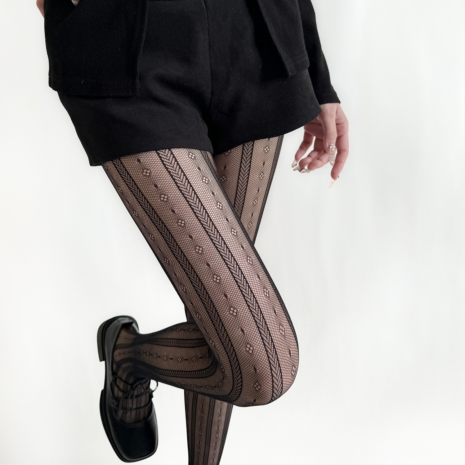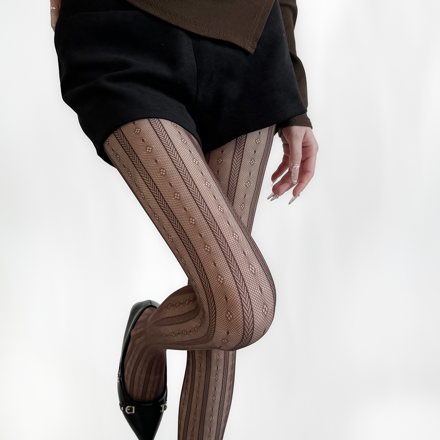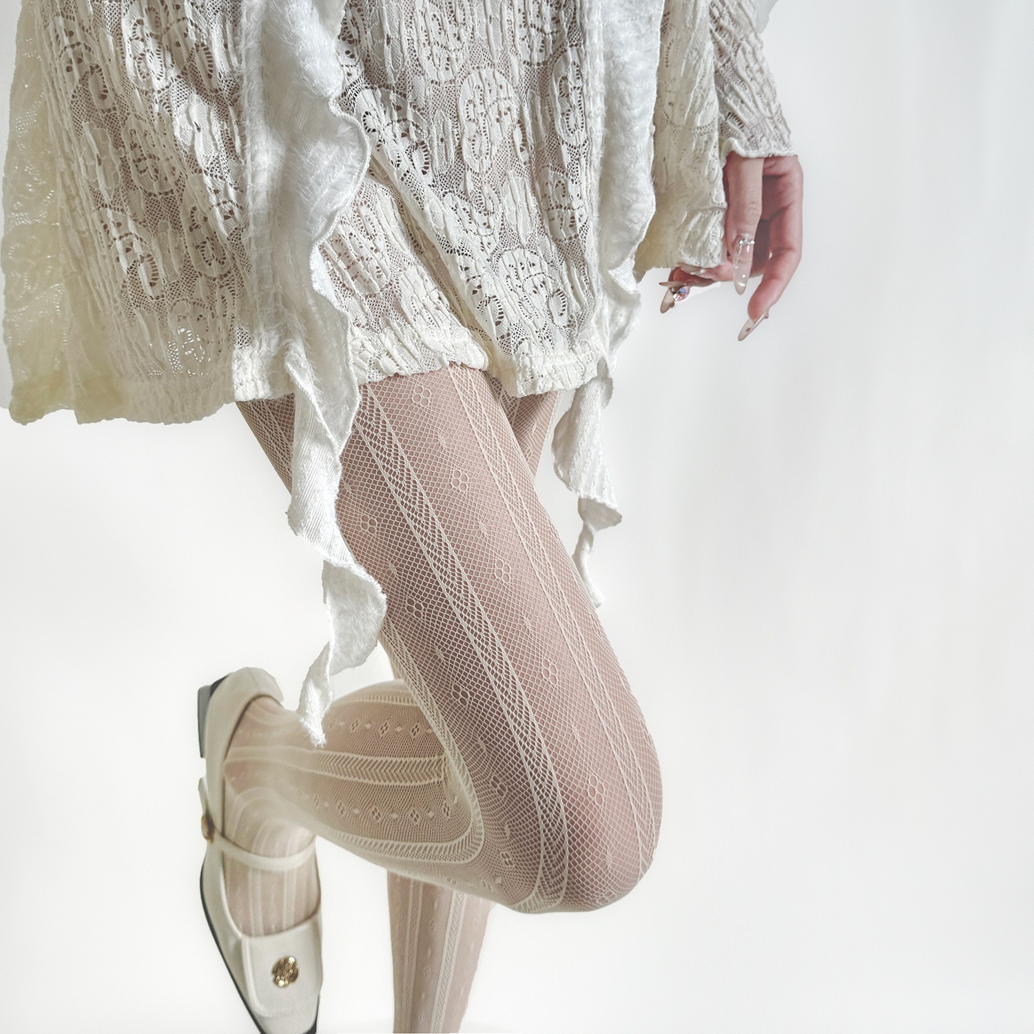 【3日出荷】レトロ 縦縞 小花 レースタイツ 春秋 細網 防ほつれ 高伸縮 薄手 多色ストッキング