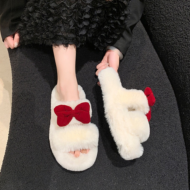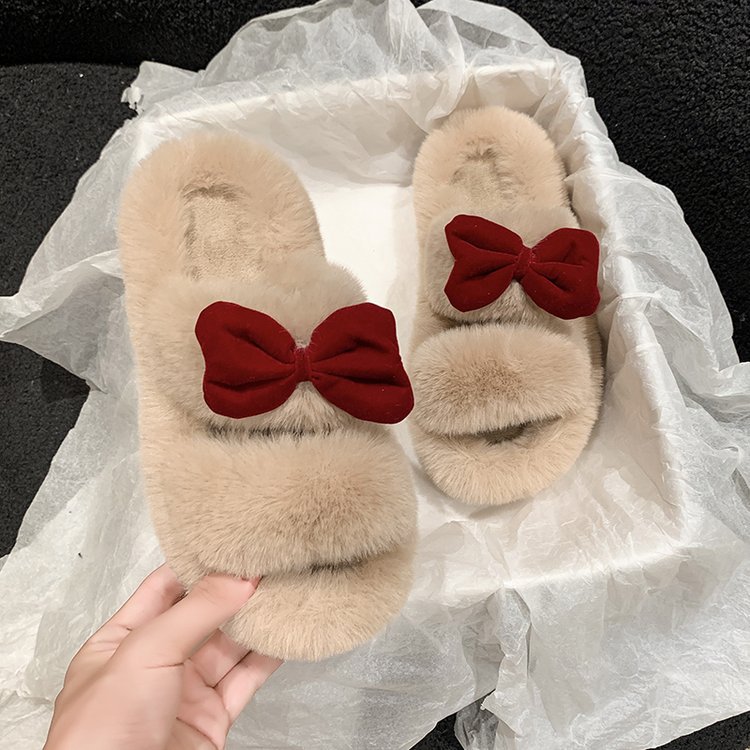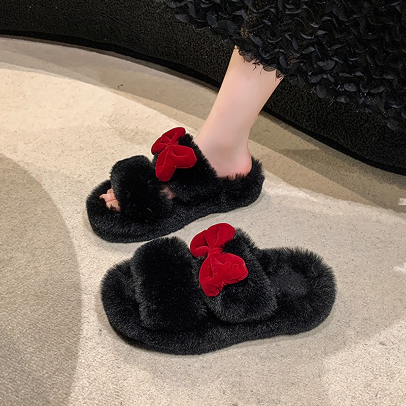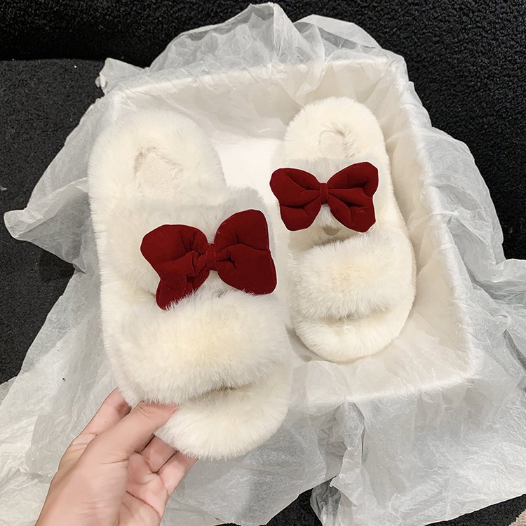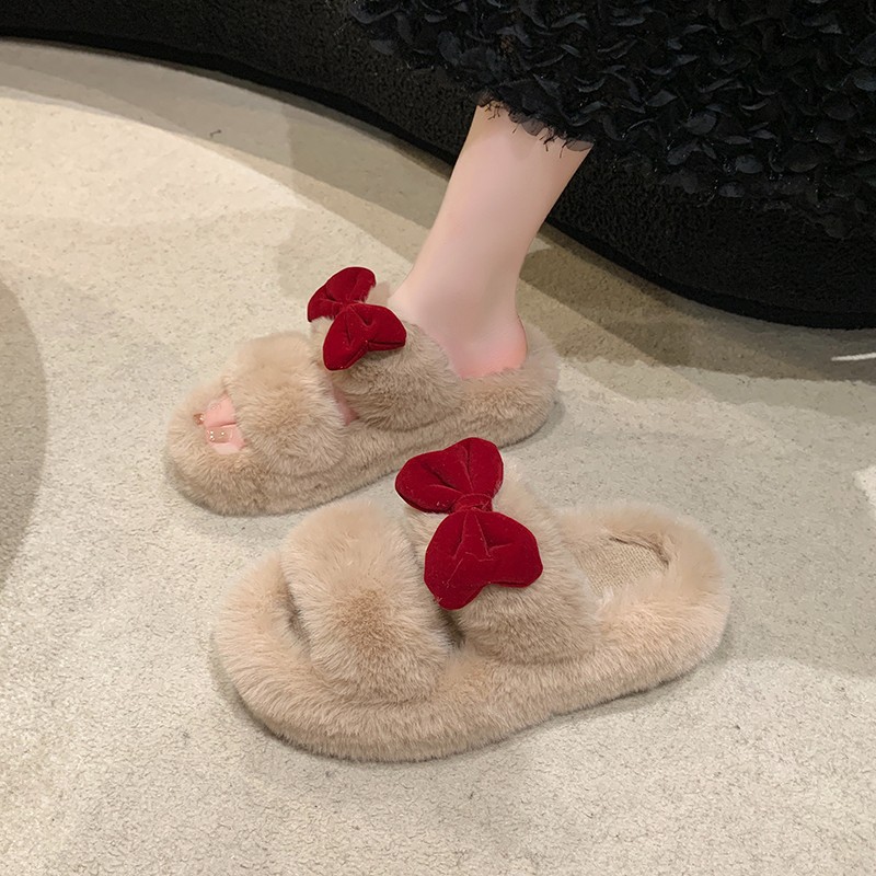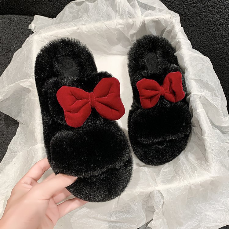 女性用蝶結びファースリッパ秋冬用厚底室内用滑り止め暖かい綿スリッパ寮生用オールマッチふかふかスリッパ