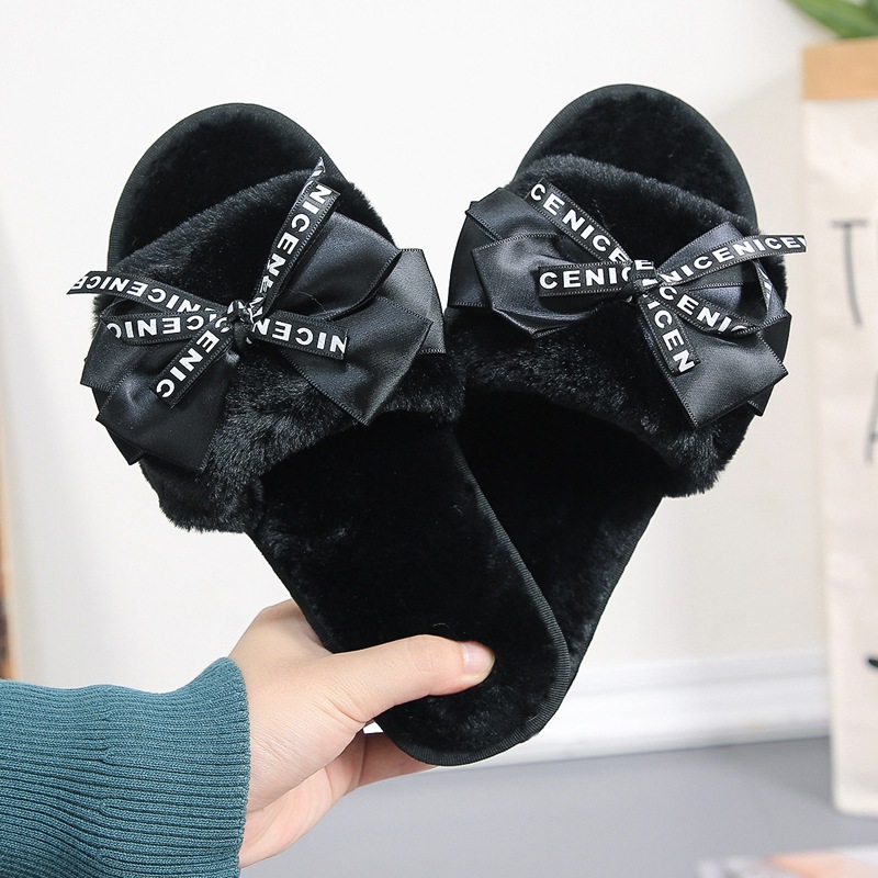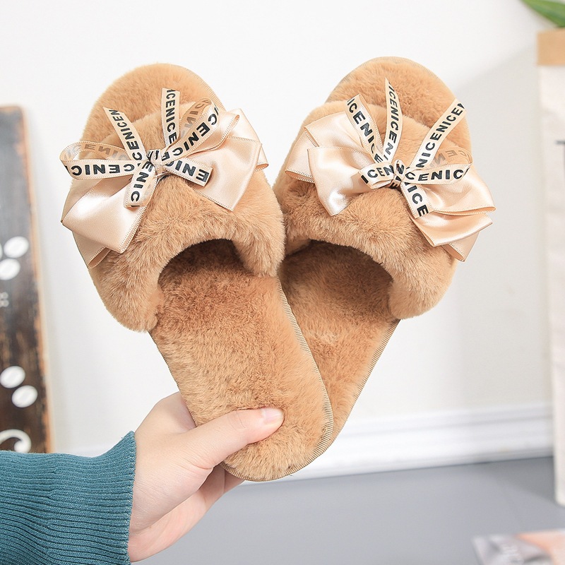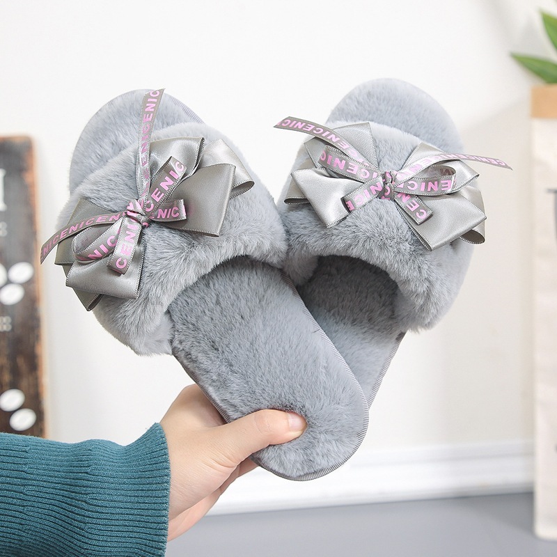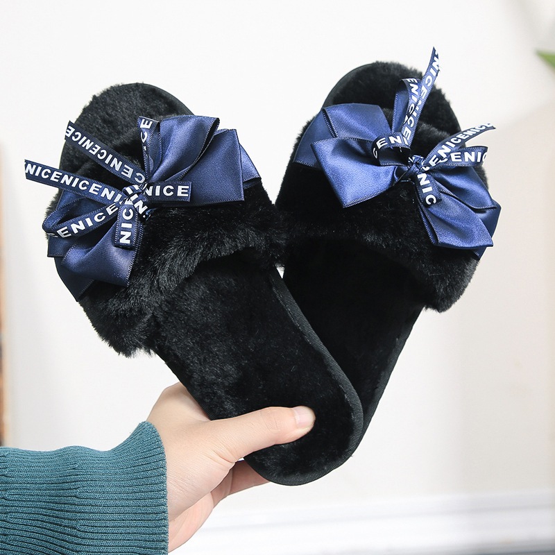 女性用のかわいい蝶結びのファースリッパ秋冬新作韓国風家庭用滑り止め木製フロアスリッパ監禁用豪華なスリッパ
