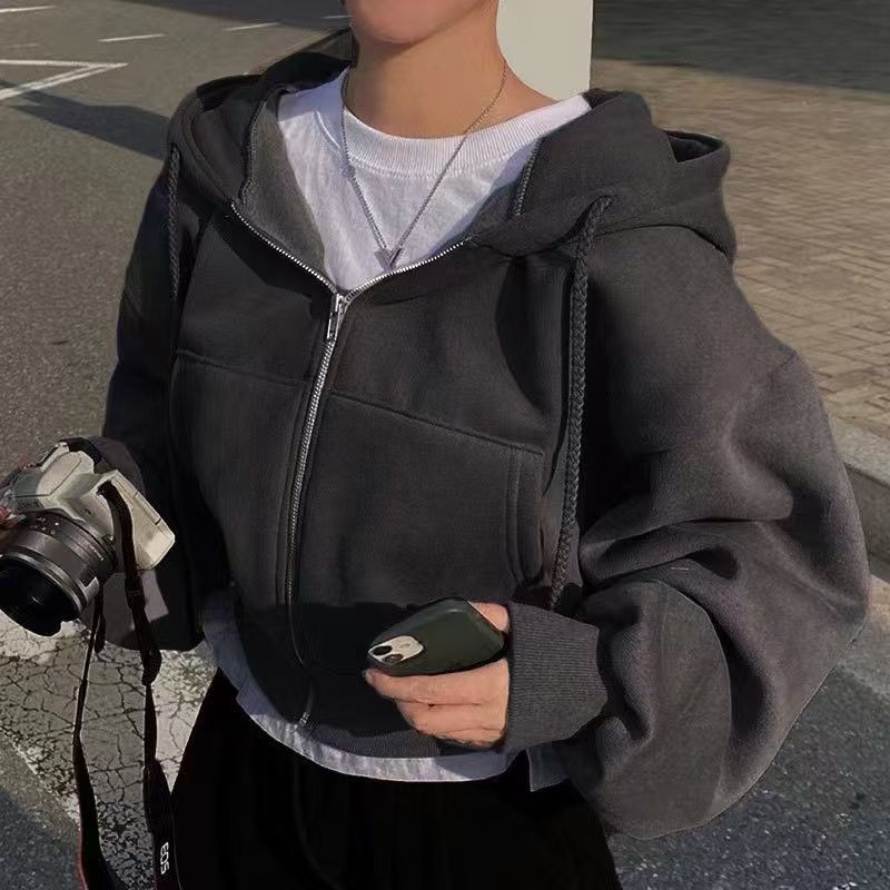 2026新入荷パーカー 2026秋冬新作ins裏起毛万能ファッションショートシルエットスリムジップアップ保温無地フーディ女性用