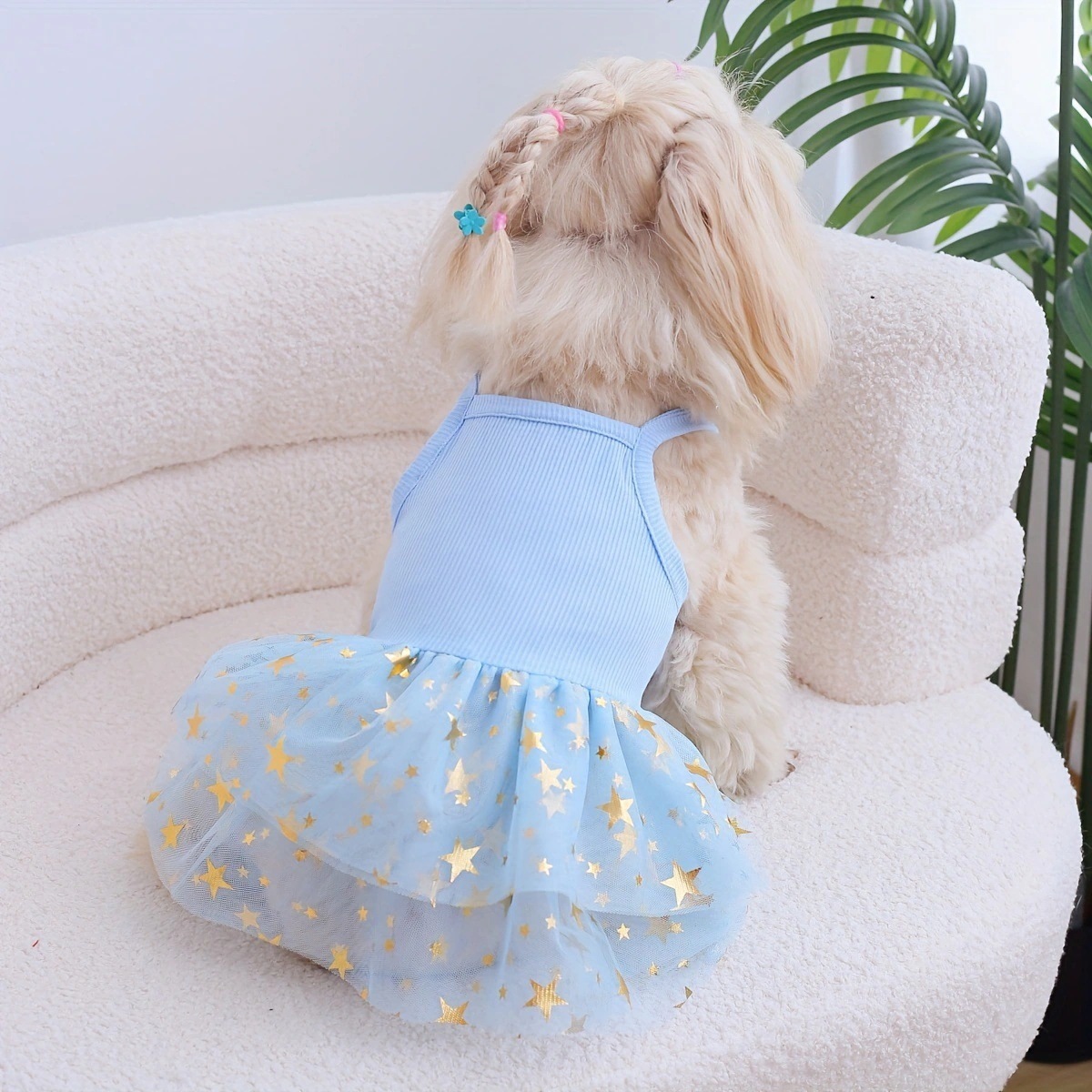 猫犬兼用ストライプニットブルー星柄 チュールフリルスカート ペット犬用スカート 四季対応 1年中着用可能