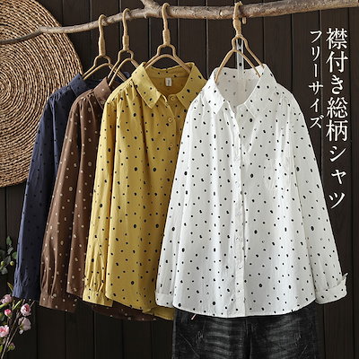 ドット柄 総柄 シャツ 長袖 レディース 襟付き きれいめ フリル 綿 コットン 羽織る 羽織れる トップス レギュラーカラー シャツブラウス ボタン 前開き 柄 ギャザー 体型カバー ゆったり ライ
