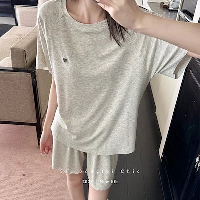 【ハート刺繍】夏用パジャマセット タンクトップ+ショートパンツ 2点セット 通気性 ストレッチ 部屋着 2025夏新作