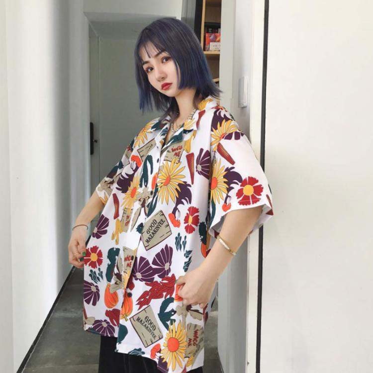 夏レディースオーバーサイズアロハシャツ菊の花総柄柄シャツ開襟体型カバー五分袖オープンカラー総柄シャツ羽織り花柄プリント半袖シャツストリートビーチリゾート海辺ビッグシルエ