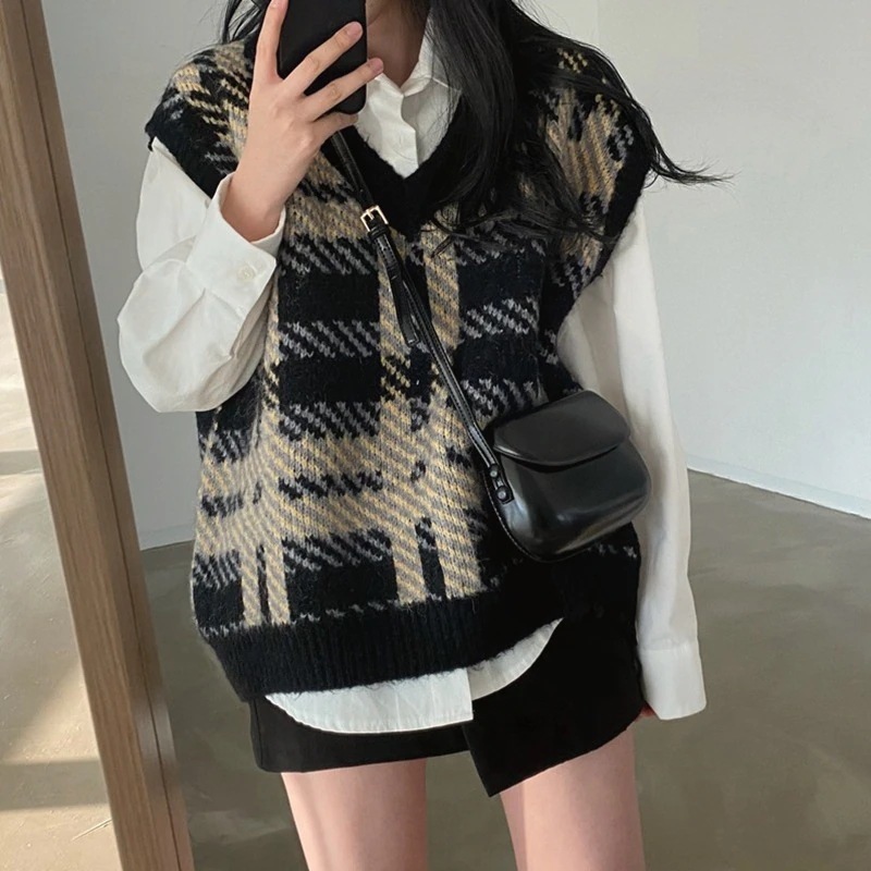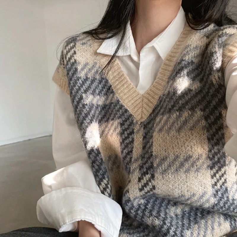 レトロVネックチェックニットベスト 秋冬ゆったり重ね着できる爽やかニットベスト2025新作ベスト