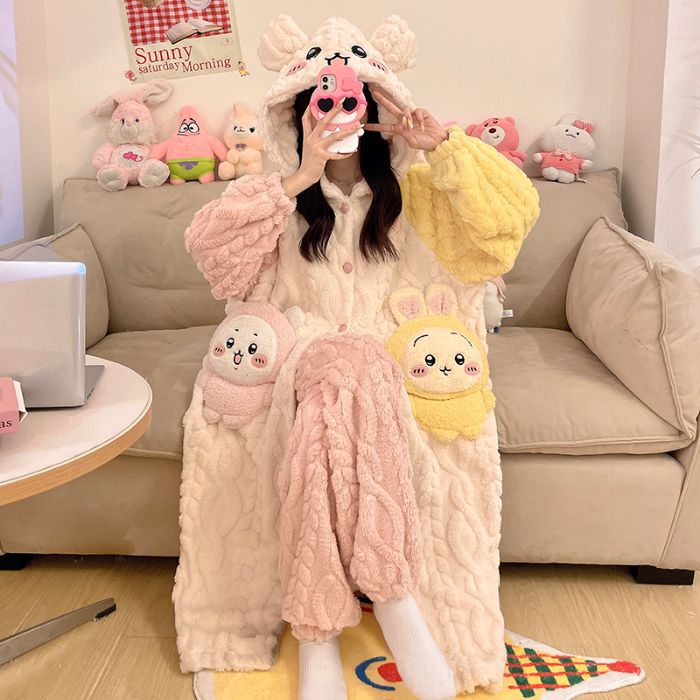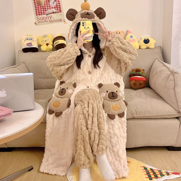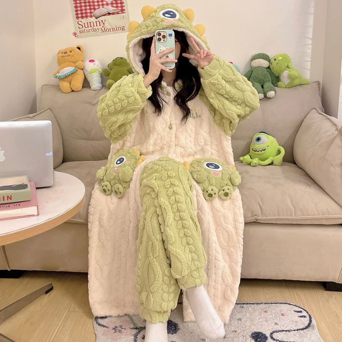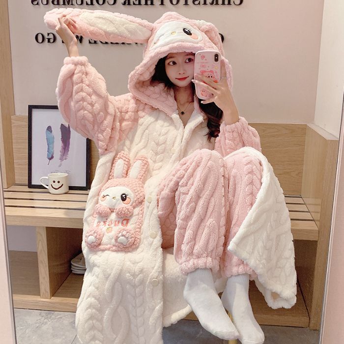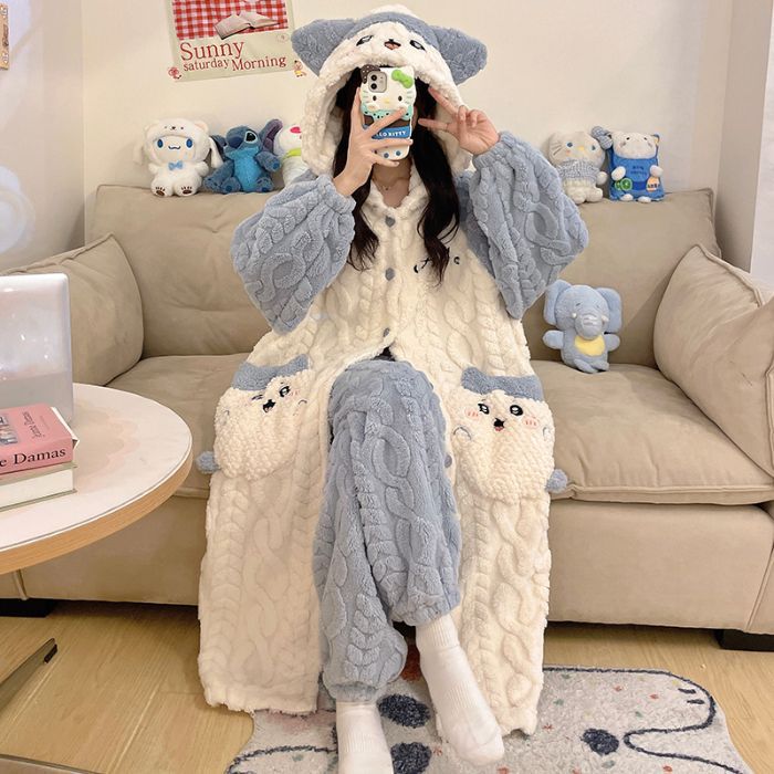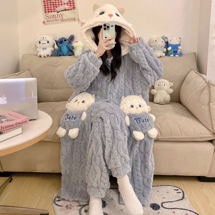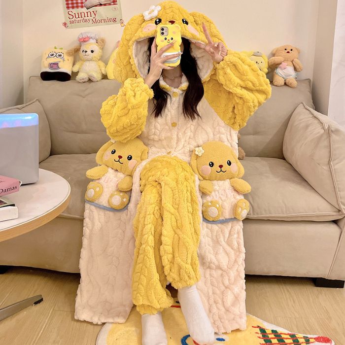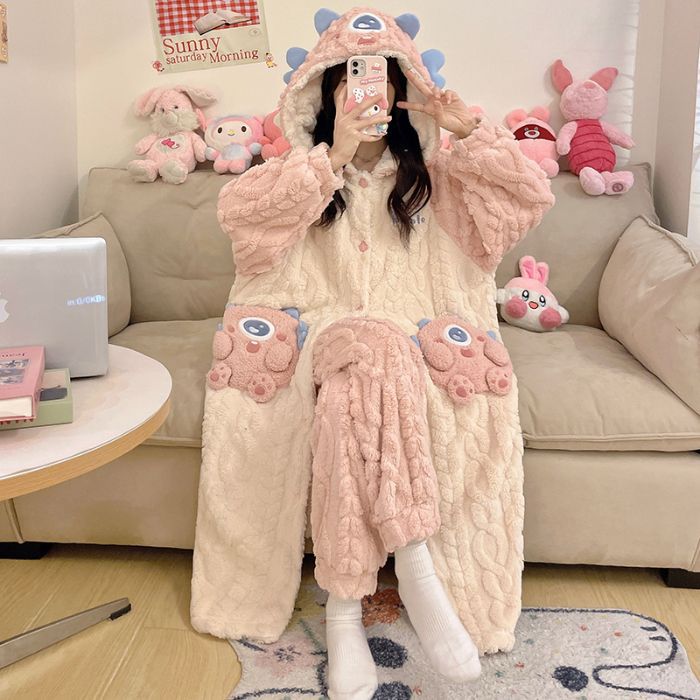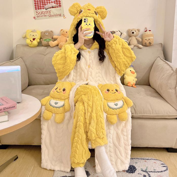 【 秋冬爆款ヒット】新作 コーラルフリース パジャマ レディース 秋冬 可愛い キャラクター 裏起毛・厚手 フード付き ガウン パンツ ツーピース ルームウェア