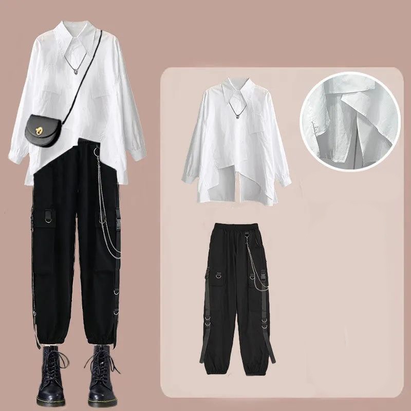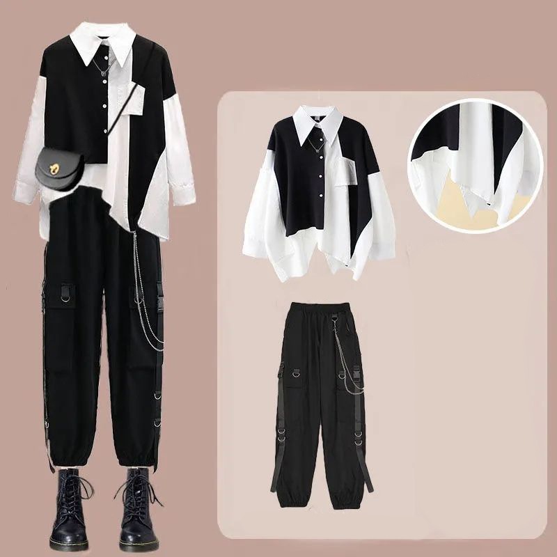 新しい ゆったり セットアップ 韓国ファッション 長袖シャツ+カーゴパンツ 2点セット カジュアル 上下セット 男女兼用