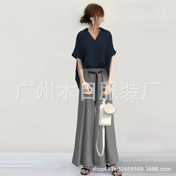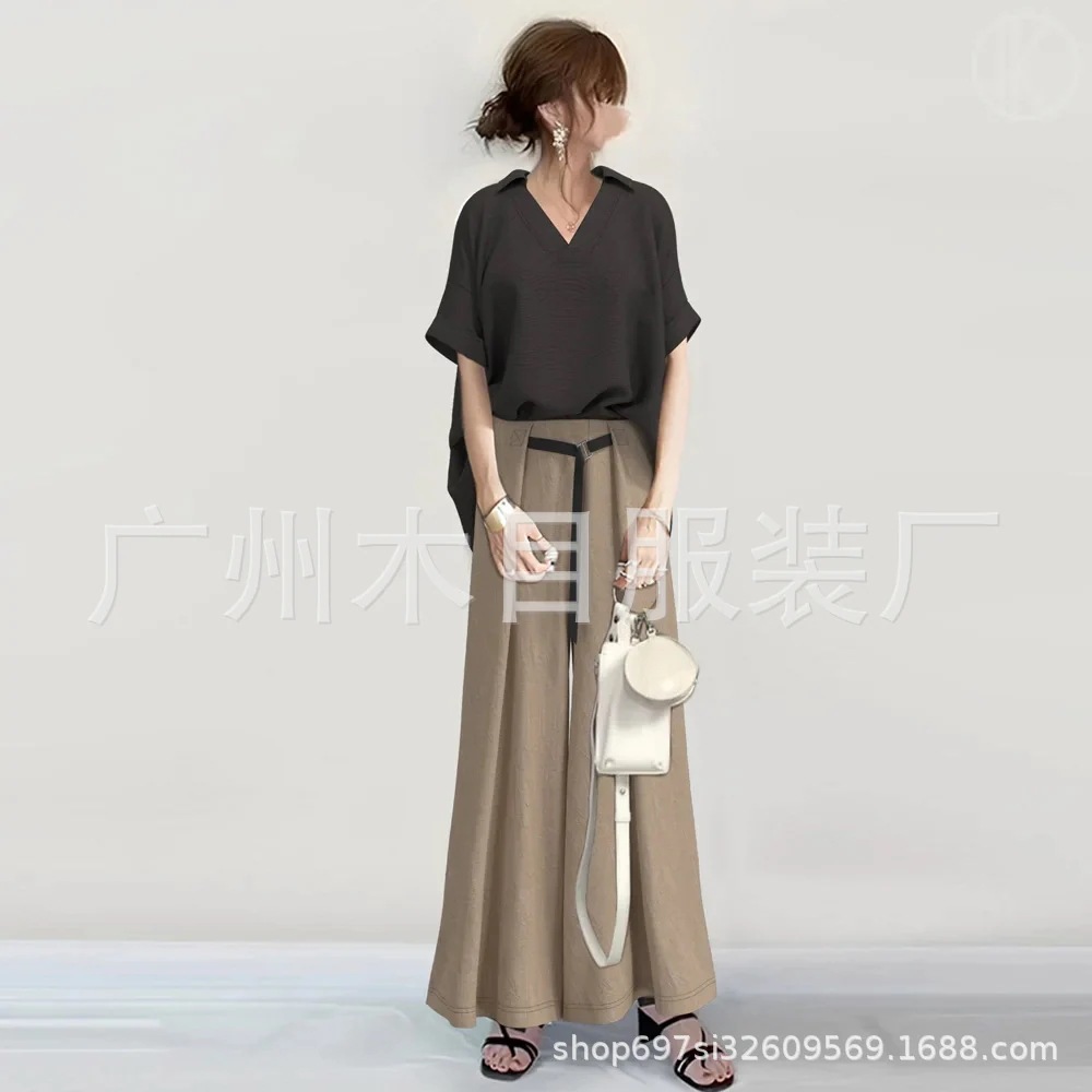 即納品 クロスボーダー人気セットアップ女性用 2025年夏新作 襟付き半袖トップス+ワイドパンツ ストレートパンツ女性用セット