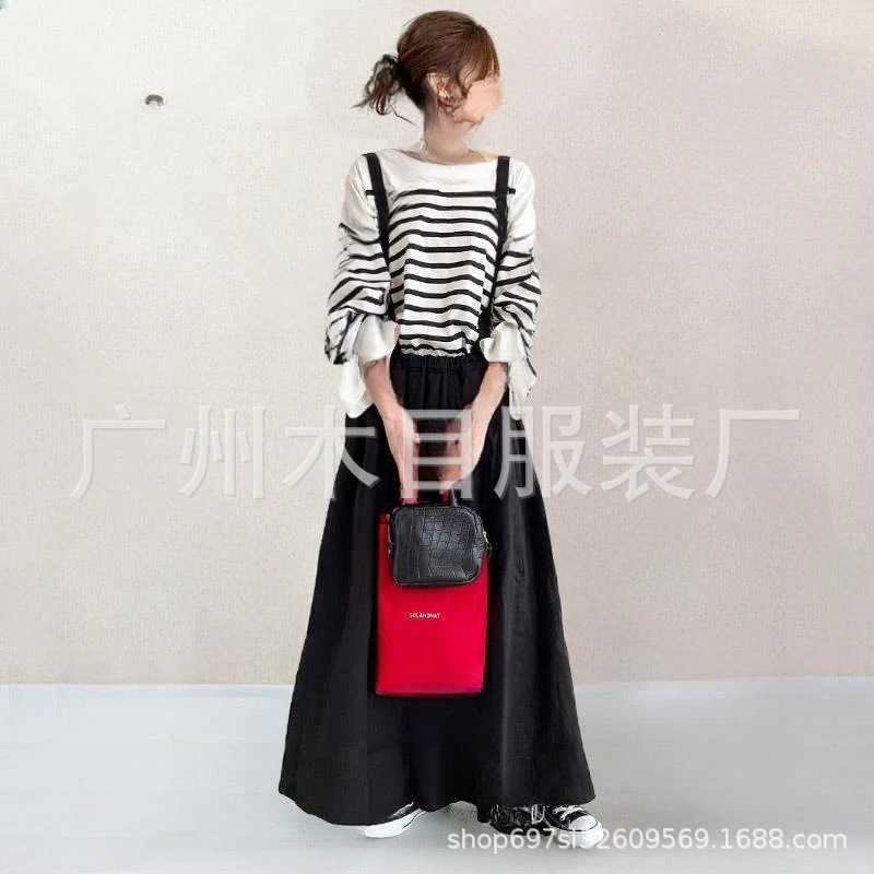 2025年秋新作レディースセット 和風ラウンドネックストライプ長袖トップス+ストラップドレス2点セット