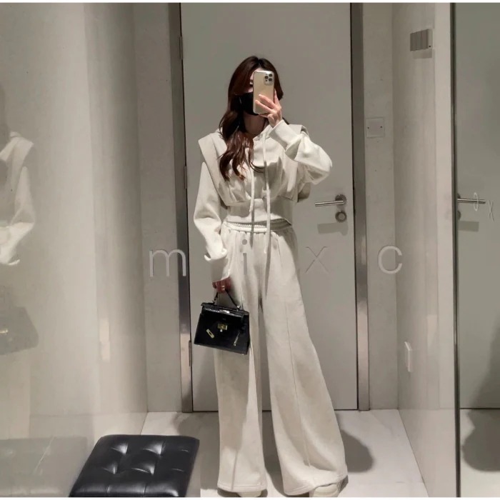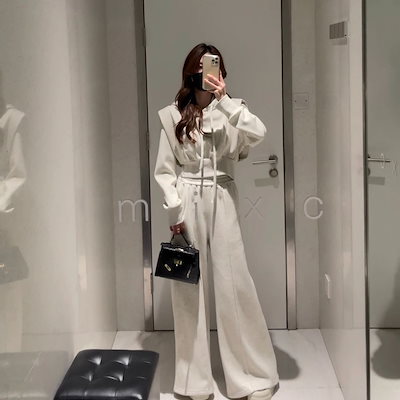 セットアップ 韓国ファッション 涼しく楽ちんセット ドローストリング付きフード付きスウェット ワイドパンツセット 新作春秋ファッション2点セット