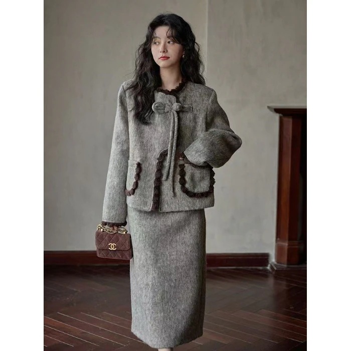 セットアップ 韓国ファッション 涼しく楽ちんセット 2025年新作冬グレー小柄フレンチ風ファッションコート スカート ゆったり万能セット レディース