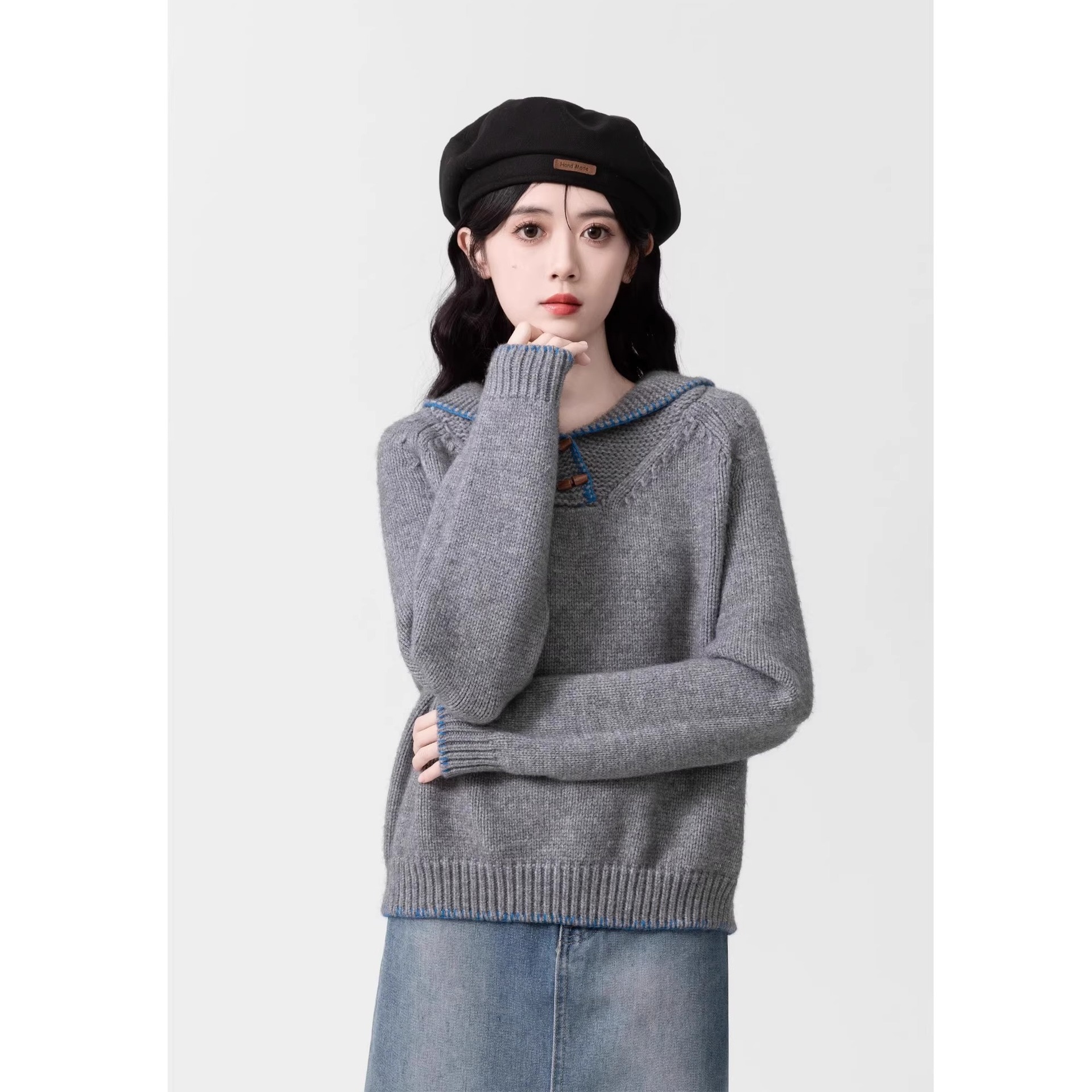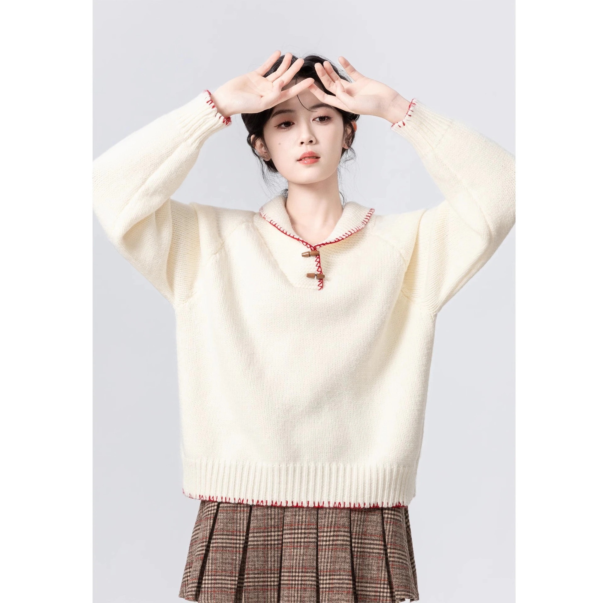 高級感あふれるおしゃれなコントラストカラーのラペルボタン付きニットトップスゆったりとした柔らかな着心地で若々しく見える万能ロングスリーブプルオーバーセーター