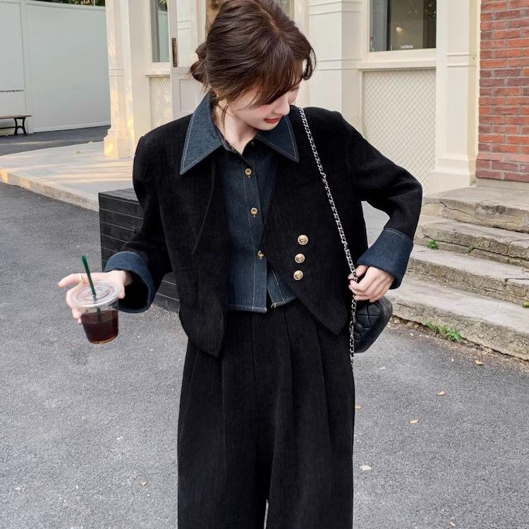 高級感 レディース セットアップ レトロ ジャケット+ワイドパンツ 2点セット 秋服 フェイクレイヤード アウター/ストレートパンツ 上下セット