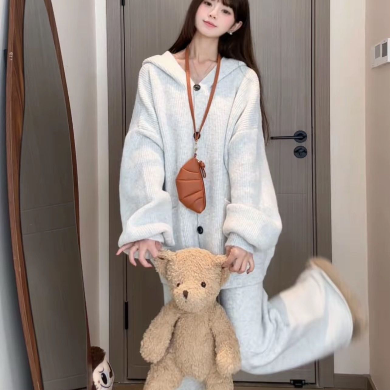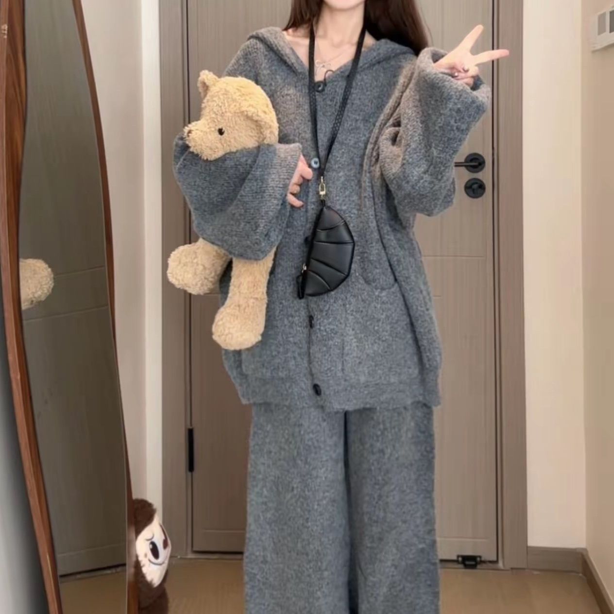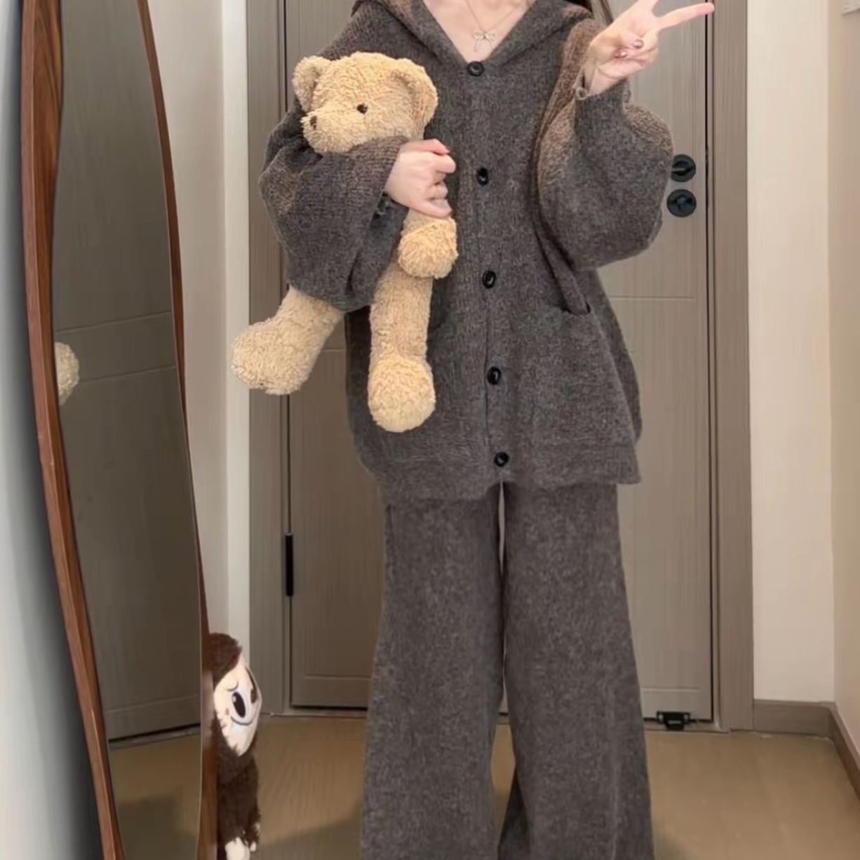 レディース カジュアル セットアップ レトロ ゆったり 長袖 カーディガン+ストレートパンツ 2点セット 上下セット