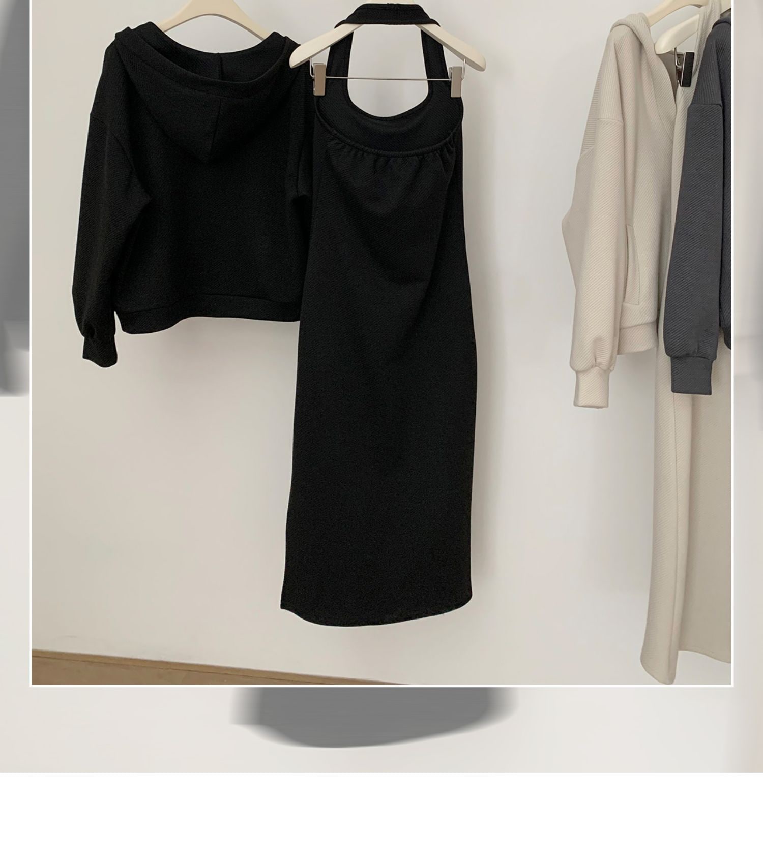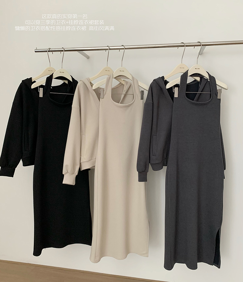2025年秋冬セットアップ スカート付きゆったりフーディネックストラップワンピース ゆったりスウェットジャケット カジュアルでファッショナブルな2点セット レディース