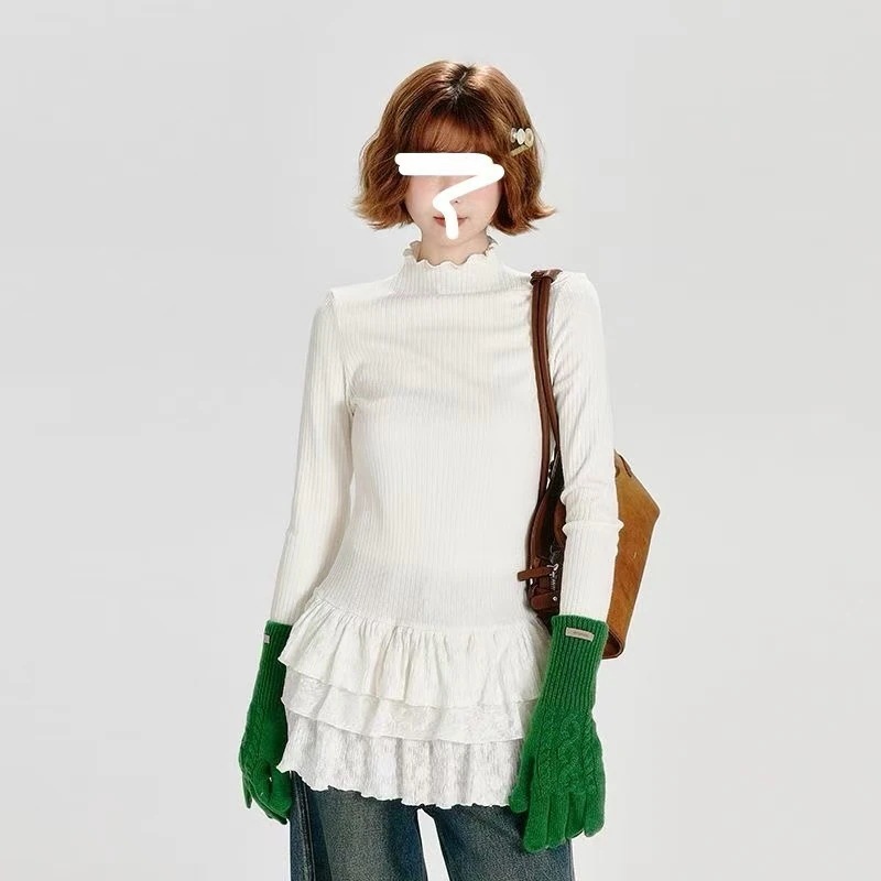 甘美な丸首長袖Tシャツ 肌着 レイヤード用女性用秋冬 レーススカート裾 切り替え ユニークで絶妙なトップス