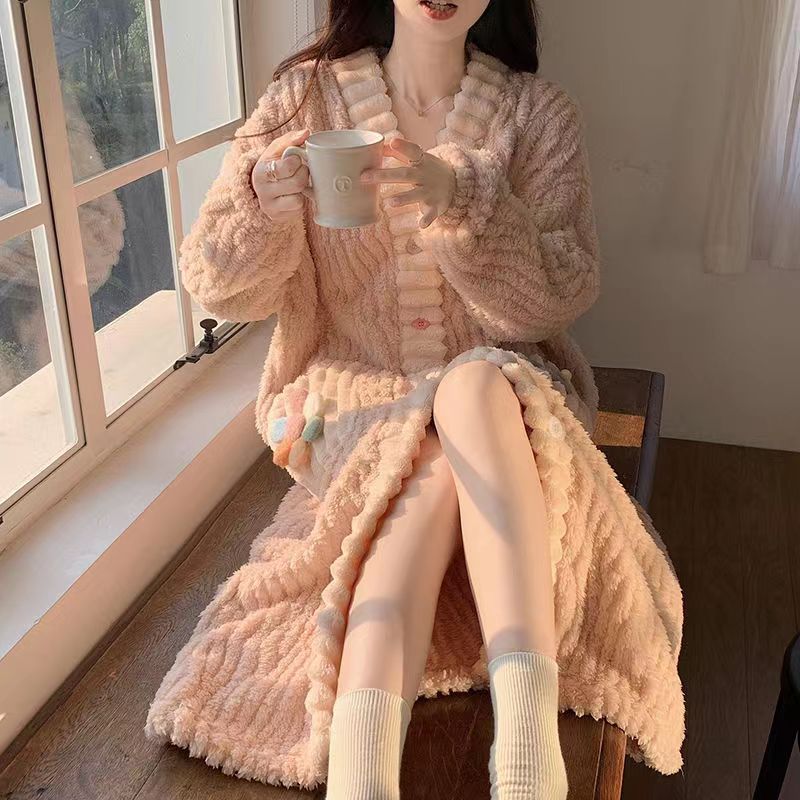仙女風レインボーフラワーカーディガンガウン女性用冬用コーラルフリースパジャマルームウェア兼用 暖かいセット