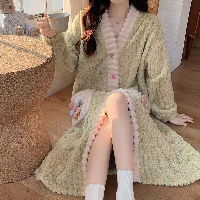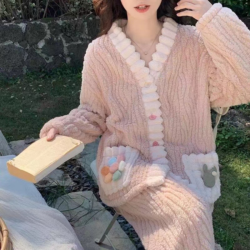 秋冬用レインボーパジャマカーディガンセット ホームウェア 女性用 コーラルフリース 厚手保温 産後用パジャマ 2点セット