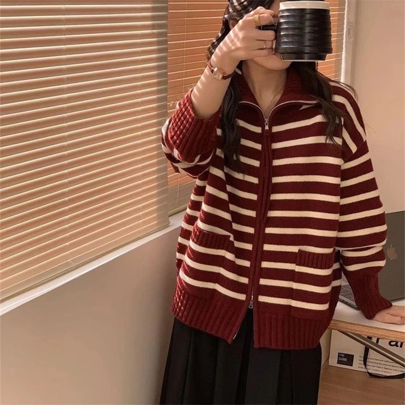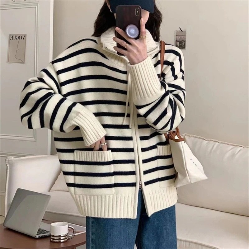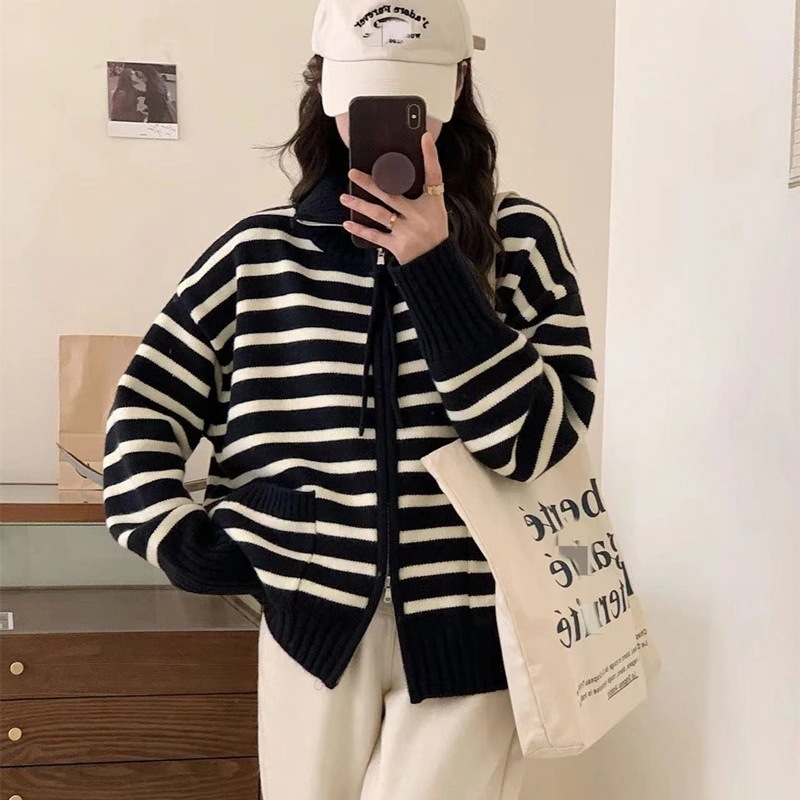 新モデル 韓版 ルーズ ファッショナブル リバーシブルカラー ニットカーディガン カラーブロックストライプ 若返り おしゃれ ジッパー セーターコート レディース