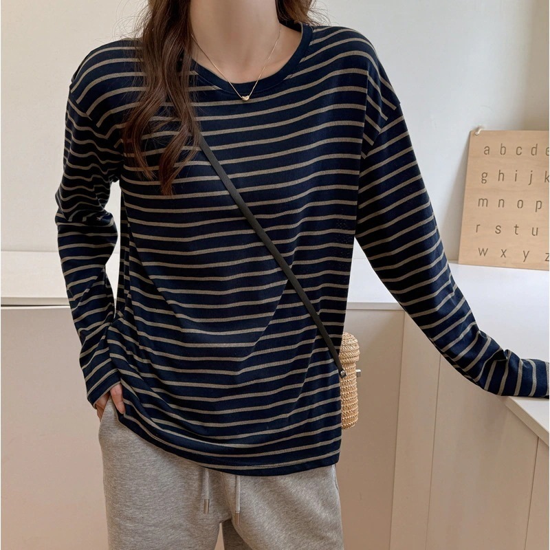 【本日限定】早秋 ストライプ 丸首 ゆったり カジュアル マルチユース 長袖Tシャツ レディース ゆるいスタイル インナー ベースレイヤー 細身効果 トップス tシャツ 長袖