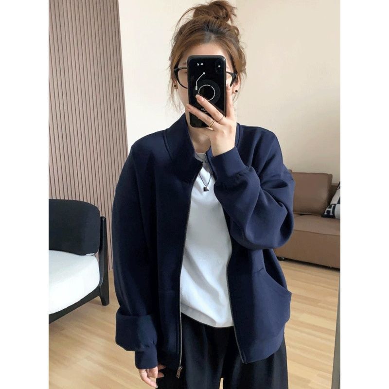 ネイビー ジッパー スタンドカラー スウェット ジャケット レディース 秋冬2025新作 韓国風 ゆったり カーディガントップス