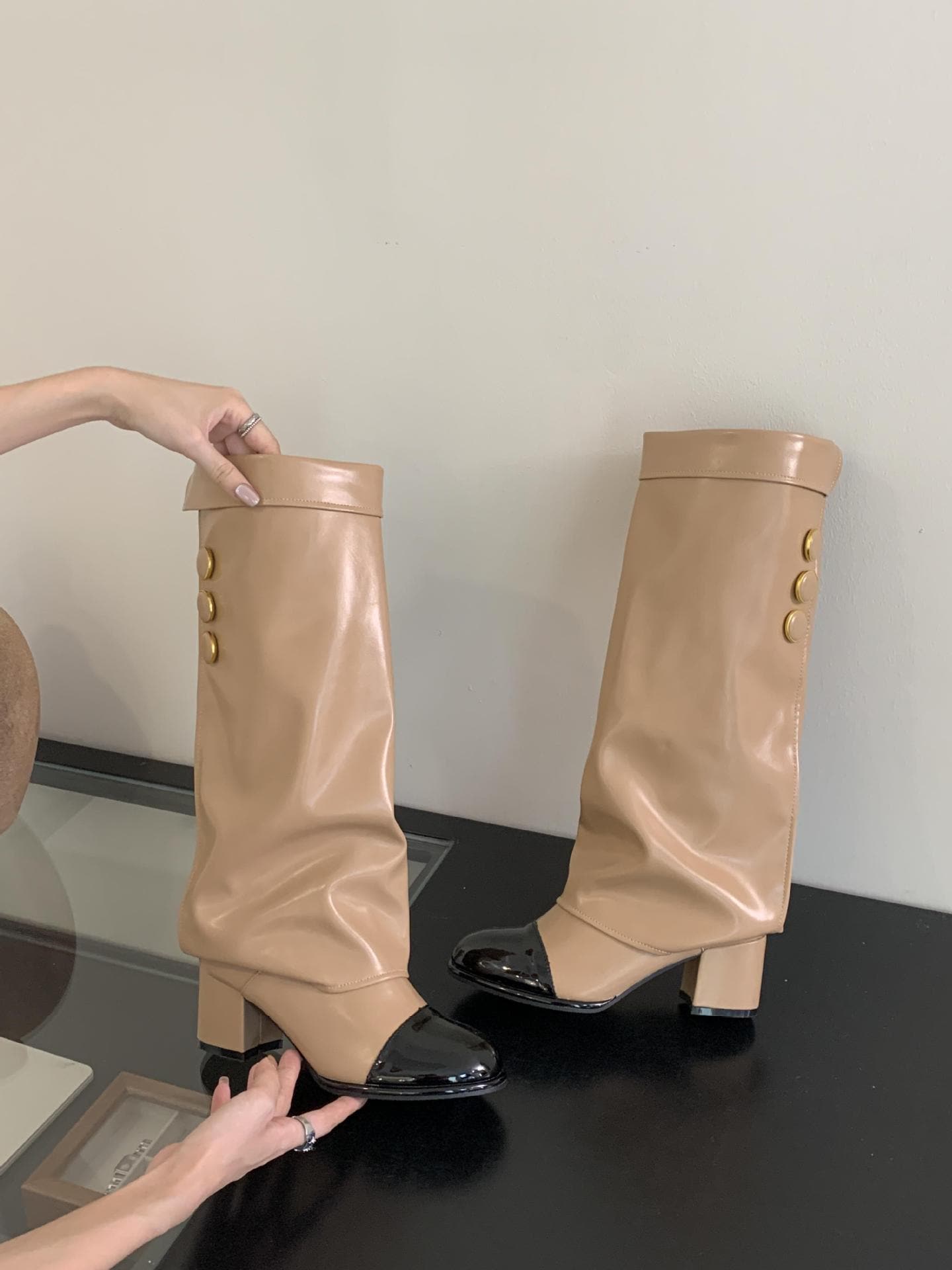 ブーツ 丸頭 ツートンカラー ライダーブーツ 2025 秋 太ヒール 膝丈未満 パンツブーツ レディース