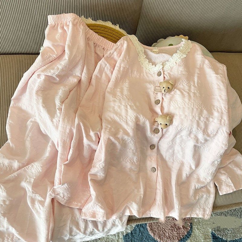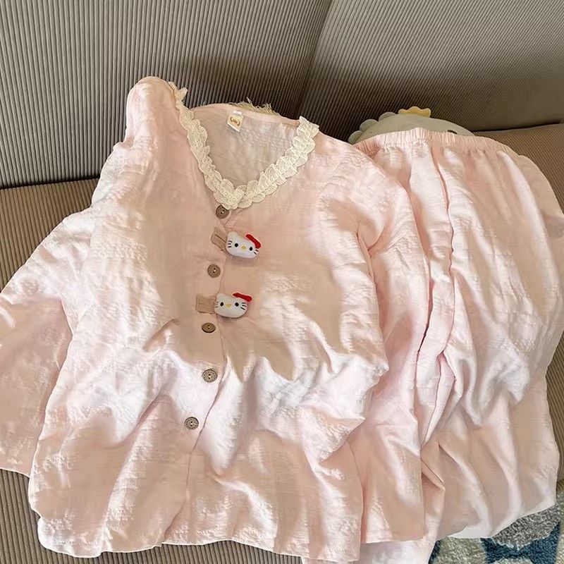 新発 胸パッド付 春秋用 女性パジャマ ピンクフリル キティ猫 ロングスリーブ 2ピース スイートホームウェア